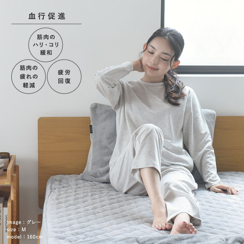 一般医療機器に届出された疲労回復ウェアで、血行を促進し、筋肉の疲れやコリを和らげてくれる効果が。着て眠るとじんわり心地よい温もりに包まれます。