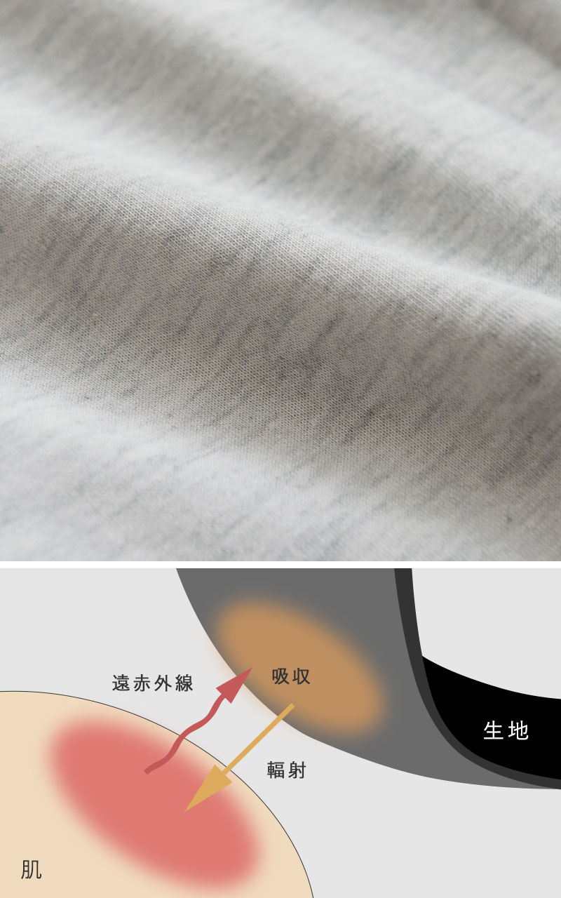 ポリエステル80%、綿20%にセラミックを定着させた繊維を使用。この繊維が身体から放出された遠赤外線エネルギーを吸収、身体へと輻射(ふくしゃ)することで、血行を促進し、疲労や筋肉のコリ等を緩和します。