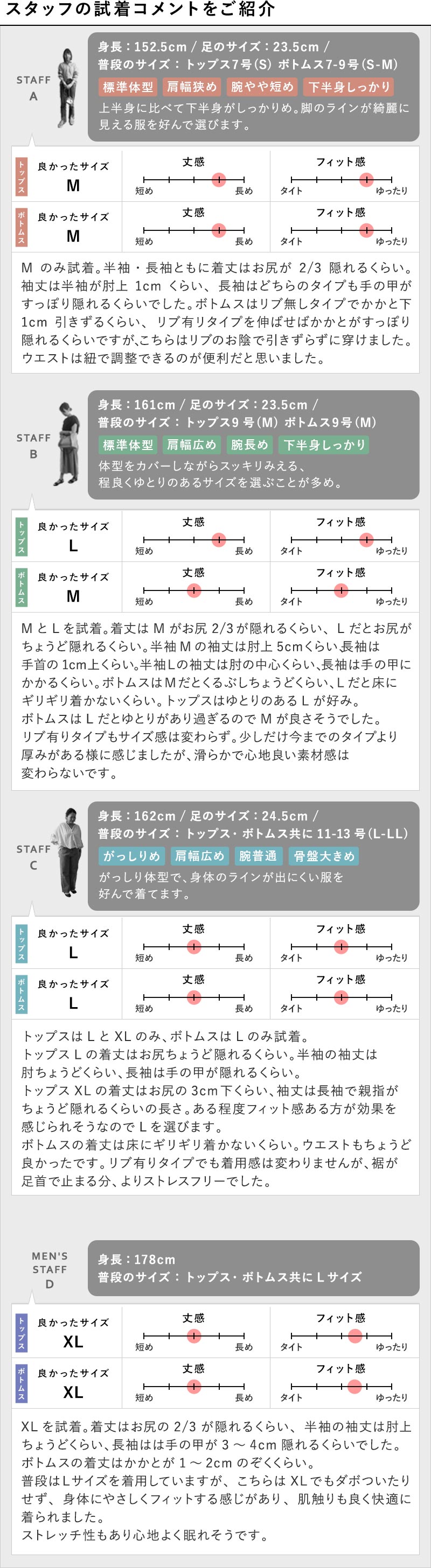 トップス・パンツそれぞれ単品での販売となりますので、上下でサイズや色を変えるなど、お好みの組み合わせで着用していただけます。
