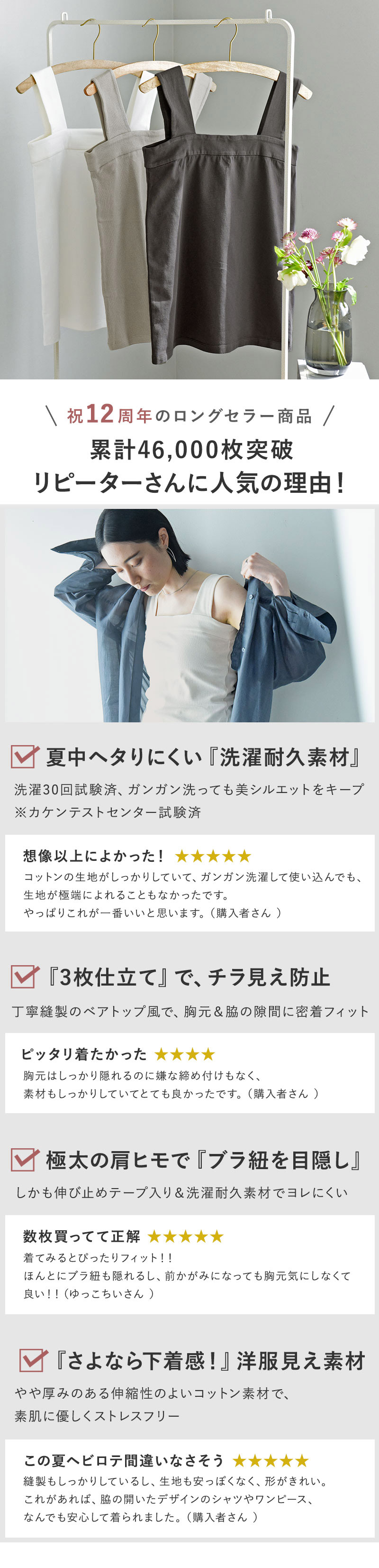 - 胸元や脇下にピタッと密着するデザイン。デコルテをすっきりと見せながら、太めの肩紐でブラ紐のチラ見せも防ぐ、大人の身だしなみにマストな1枚です。