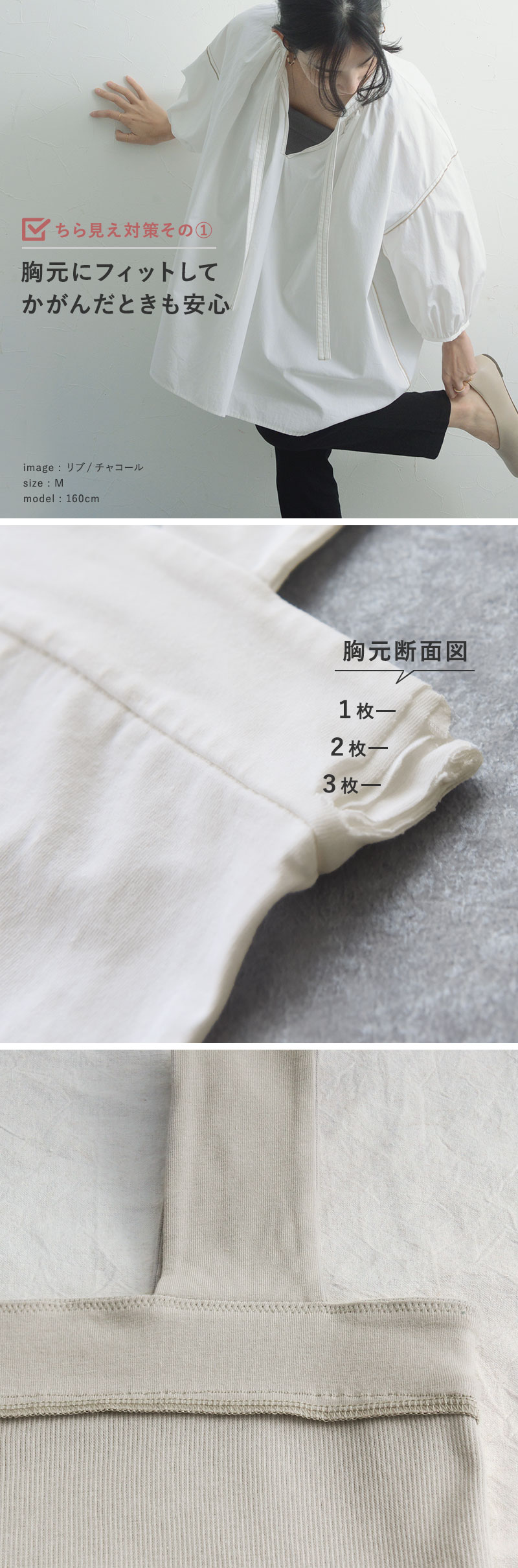 こだわりの3枚仕立て。フィットする胸元胸元の切り替え部分は3枚仕立てに。しっかりとした生地感で、バストの上部にもぴったりフィットしてくれるので、かがんだ時の胸元チラ見えの心配も軽減します。