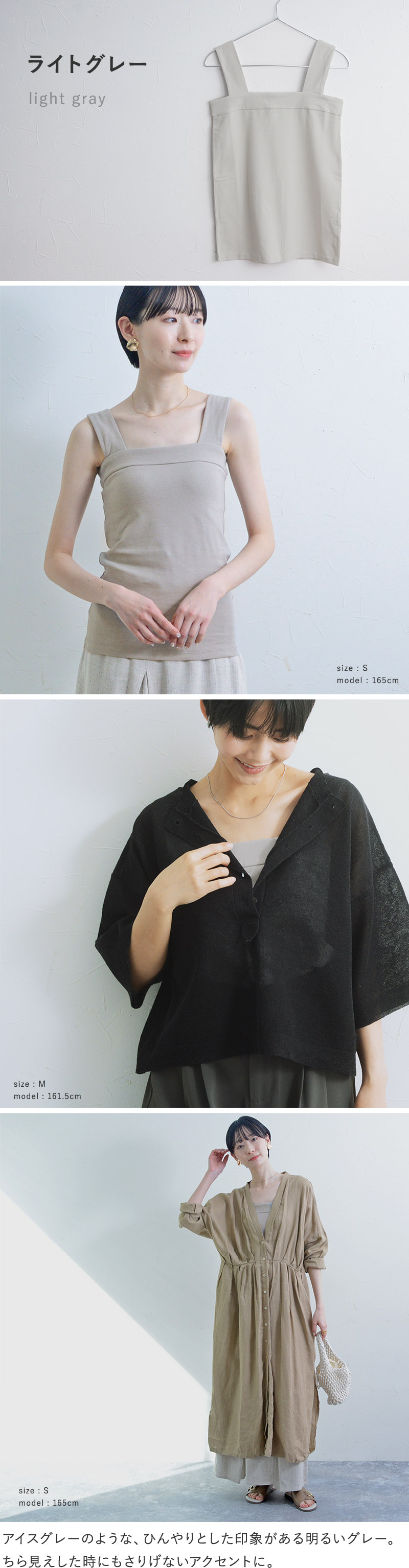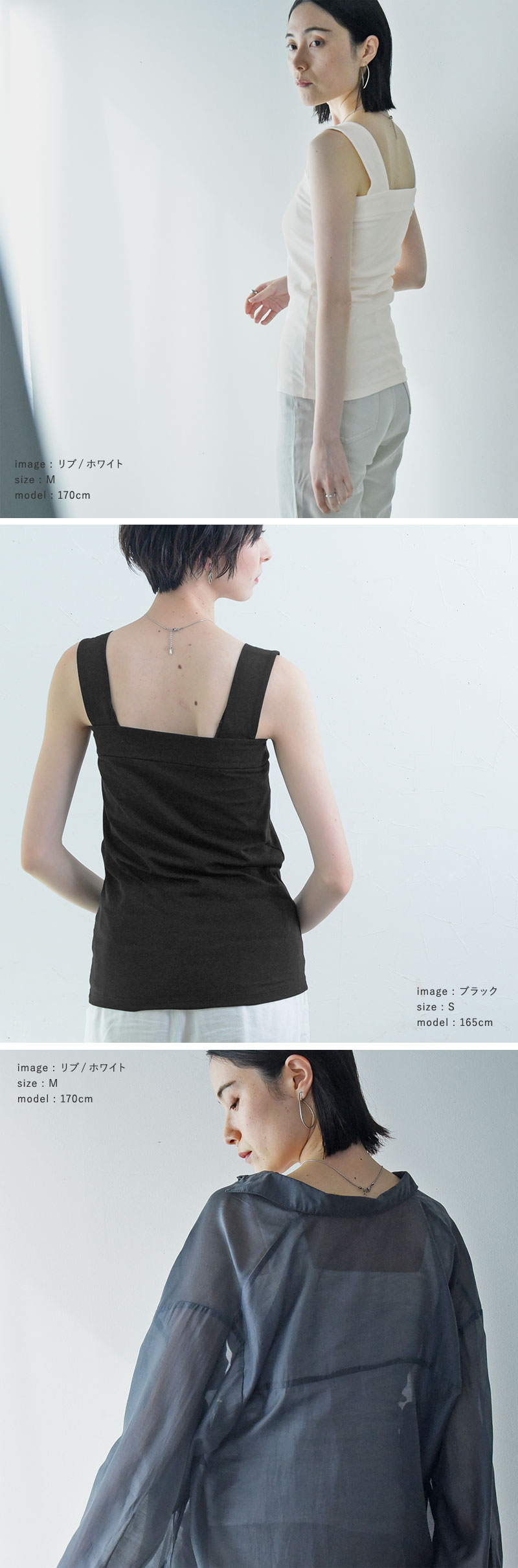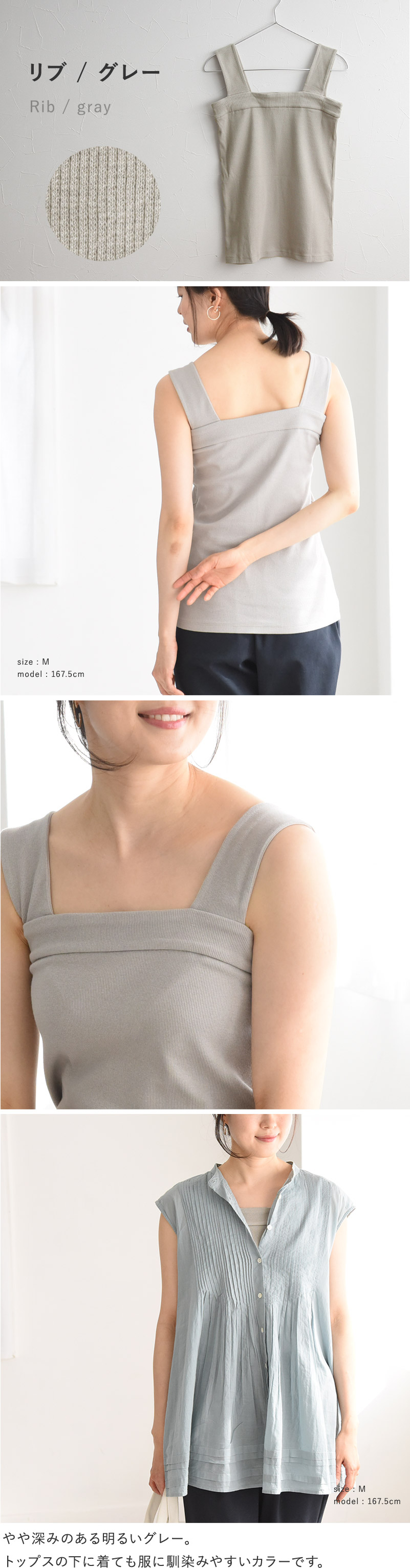 胸元の直線ラインが後ろまで続くデザインで、タンクトップでもスポーティーになりすぎず、後ろ姿もすっきり。抜き襟スタイルもきれいに決まる一枚です。