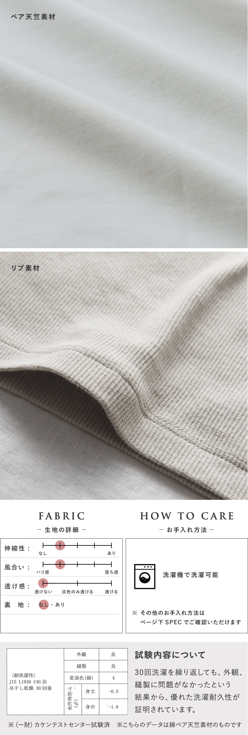ベア天竺素材、リブ素材ともに洗濯と吊り干し乾燥を30回繰り返すテストでも、ヨレやほつれなど見た目に問題がなく、シルエットをキープした安心のクオリティ。ワンシーズンだけでなく、長く使える1枚です。