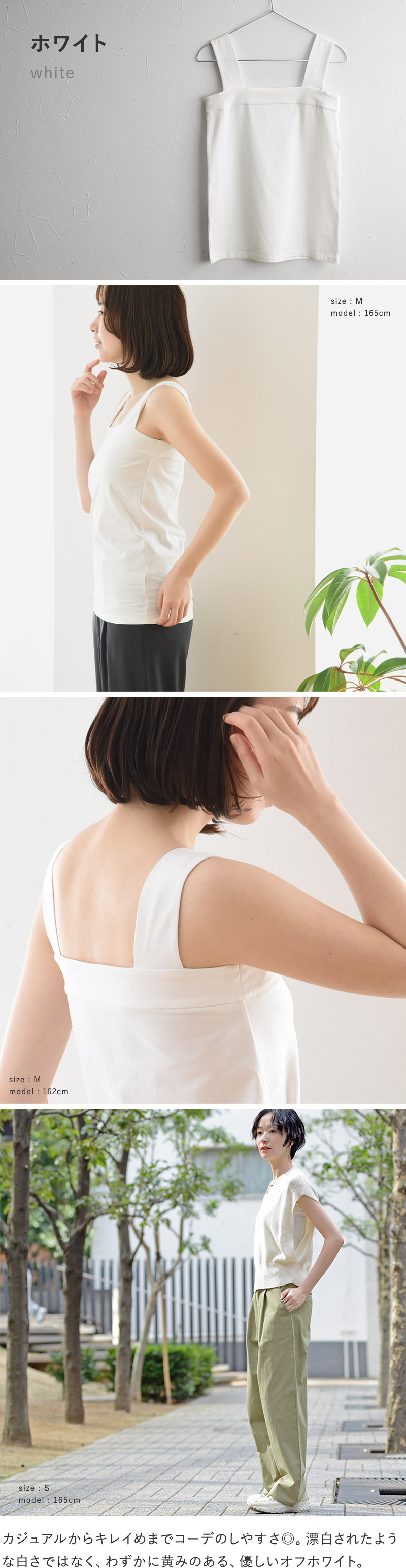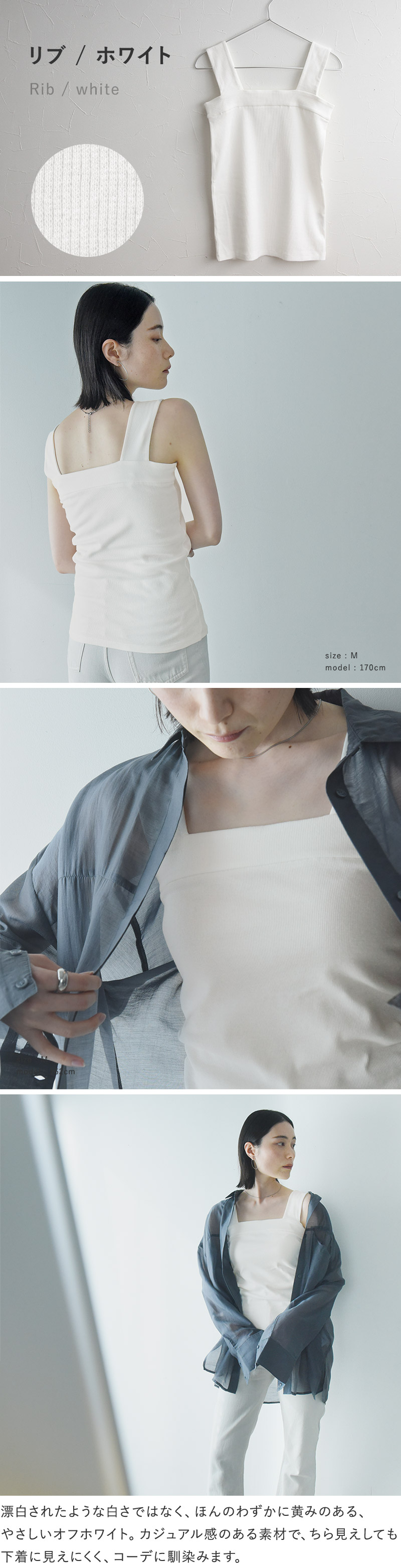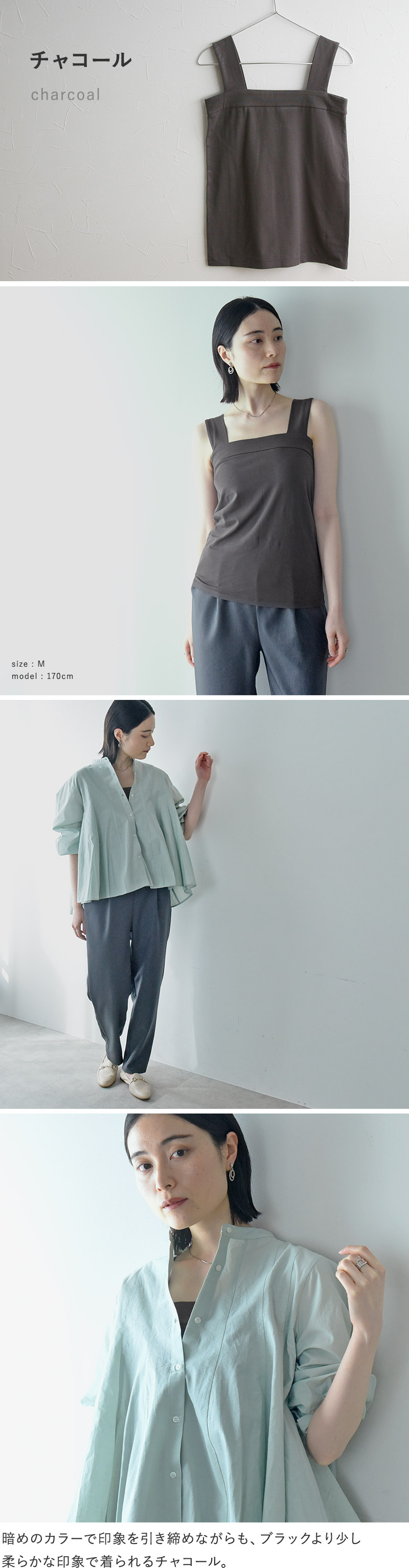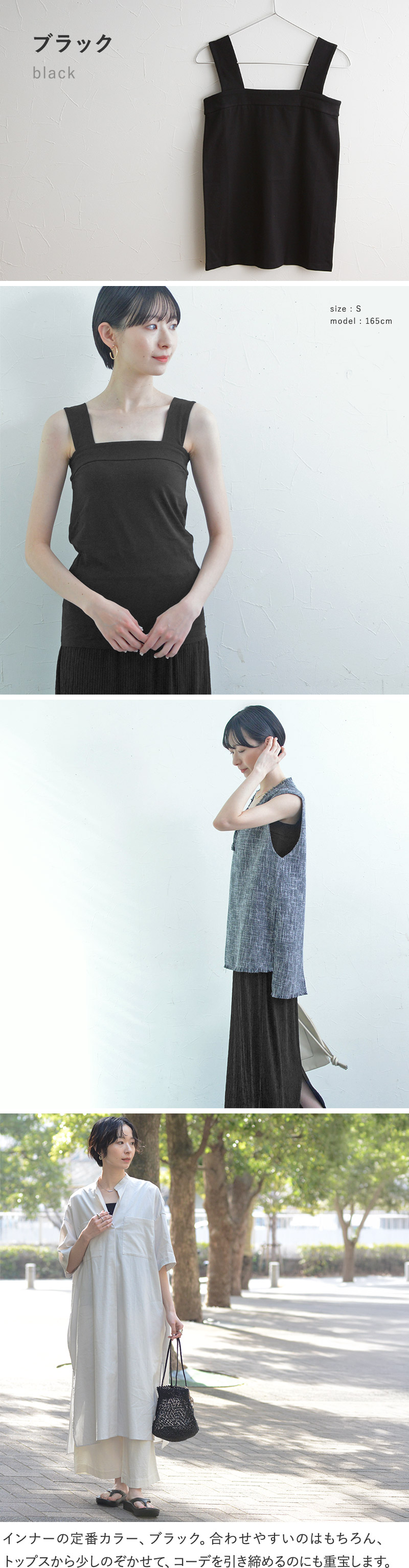 柔らかく伸びのいい素材が、胸元や脇下にピタッ。スクエアネックのすっきりとした胸元は、Vネックトップスとの重ね着に好相性。幅広な肩紐がブラ紐も隠してくれるので、透け感トップスと重ねるコーデにもぴったりです。