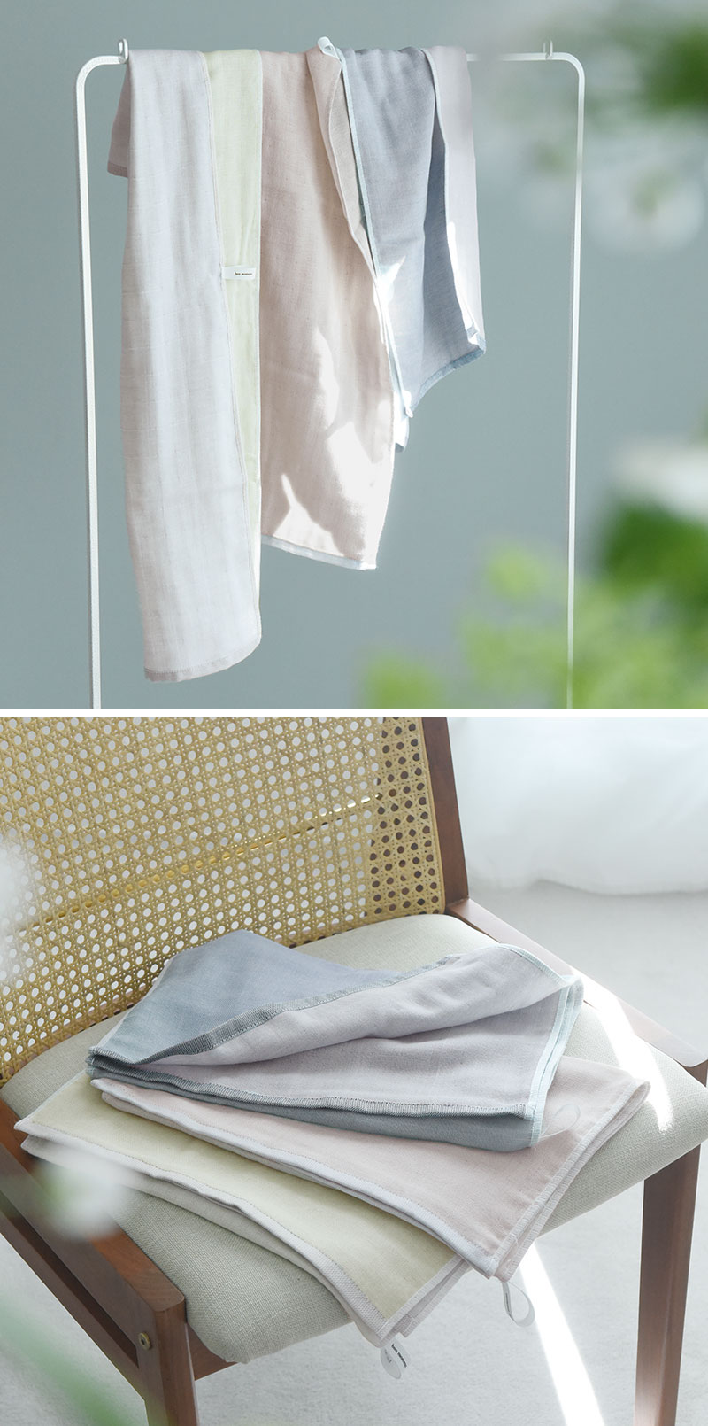POINT1 : 厚みを抑えたガーゼ素材パイル地のタオルよりも、ボリュームが少ないガーゼ素材だから、畳んだときにもペタンとコンパクト。収納も場所を取らず、すっきり片づけられます。