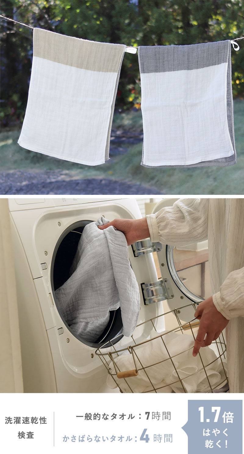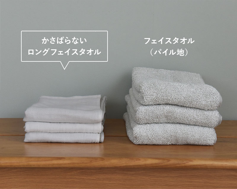 厚みを抑えたガーゼで作ることで、大幅にボリュームダウン。それでいて一般的なフェイスタオルよりも少し長めサイズなので、こまめに手洗いしても、拭ける面積が広いのもポイントです。