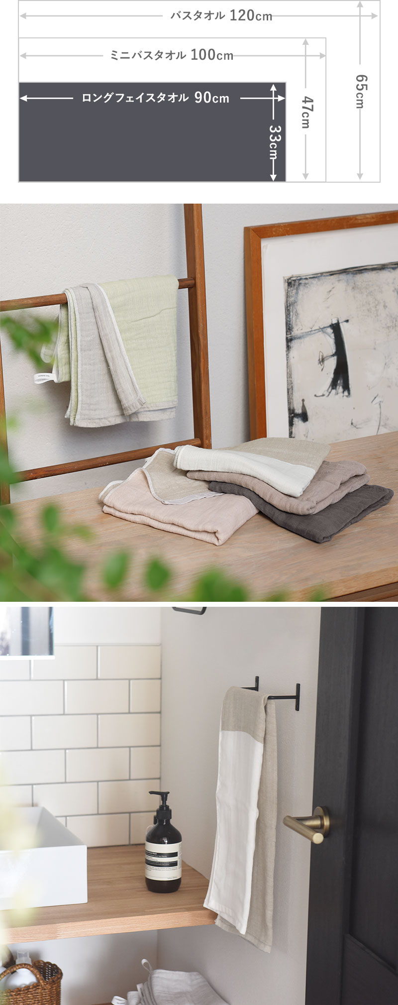 POINT2 : 頭に巻きやすい少し長めサイズ33cm×90cmのロングフェイスタオルは、一般的な80cm前後のフェイスタオルより少し長め。濡れた髪をまとめる時も頭に巻きやすく、また吸水性にも優れているから、髪の短い男性や体の小さなお子様はバスタオル代わりにも。