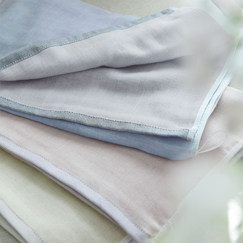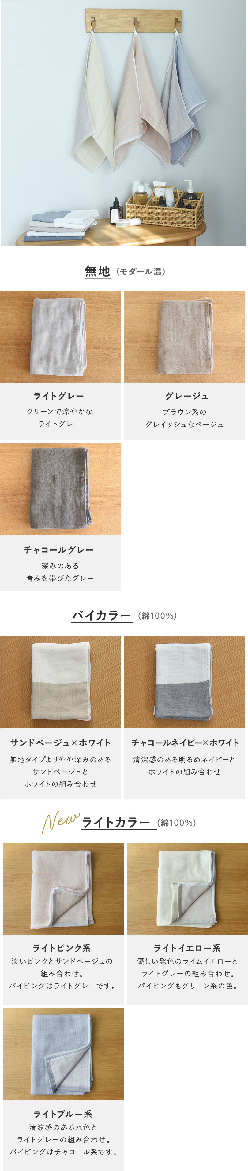 無地タイプは、柔らかくて吸放湿性に優れたモダールを横糸に使い、ゆっくり丁寧に仕上げています。バイカラータイプとライトカラータイプは、綿本来の吸水性を最大限に引き出す「後晒し」製法が生きる、綿100%で織り上げました。