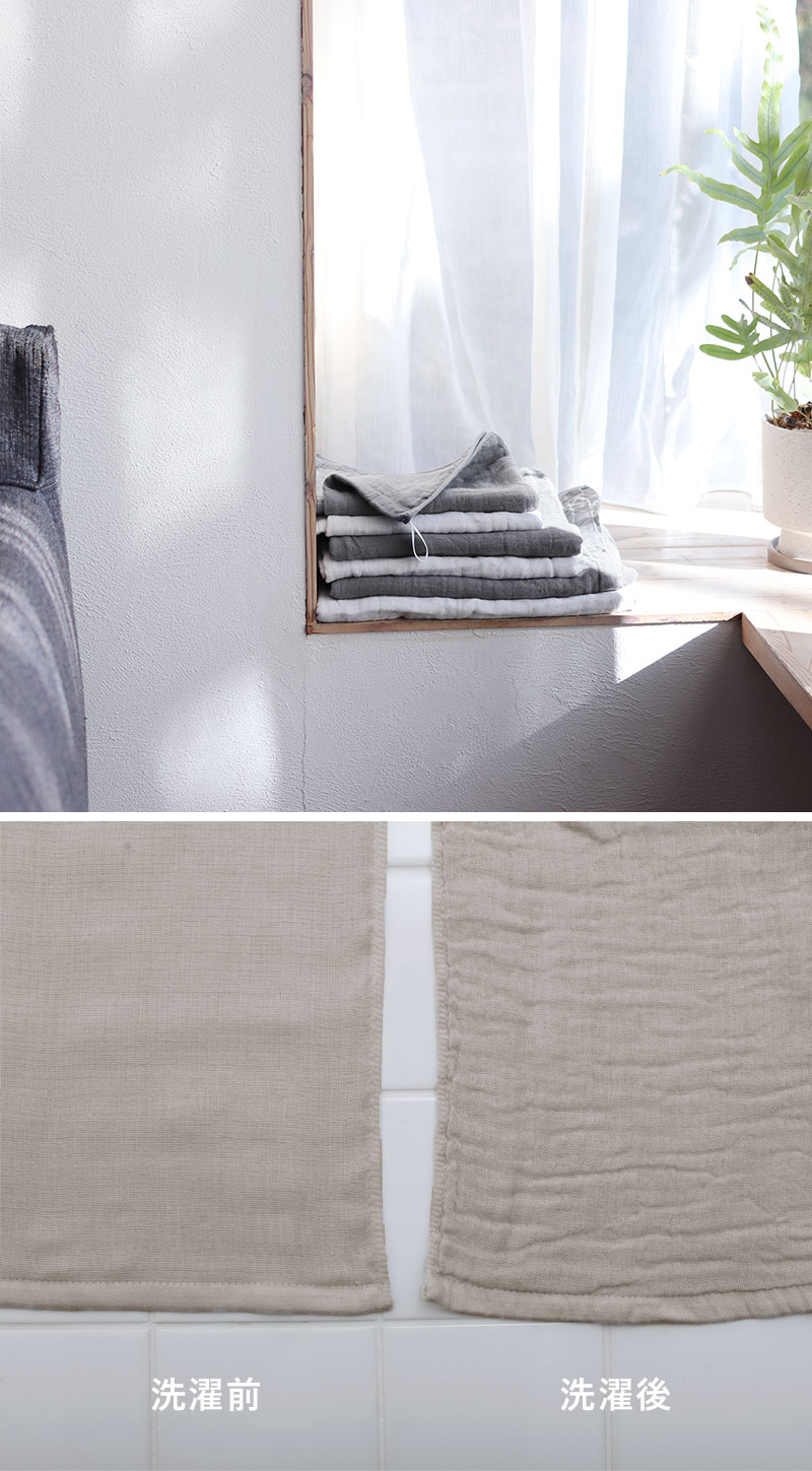 始めはハリのあるタオルも、一度洗濯をするとふんわり感がアップ。使い込むほどに優しく肌に馴染む、優しい風合いがお楽しみいただけます。