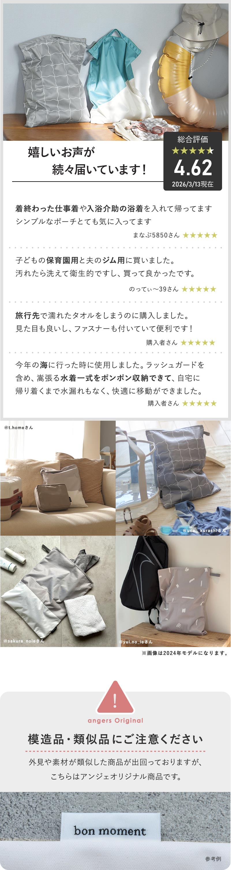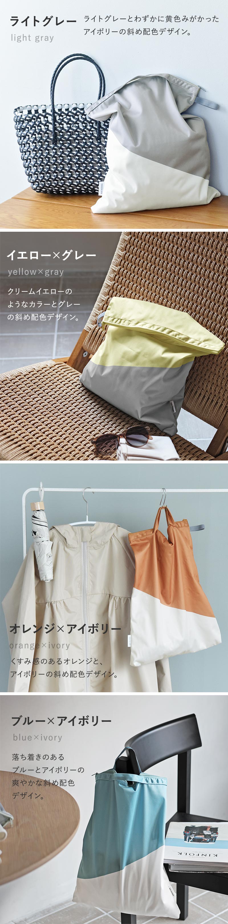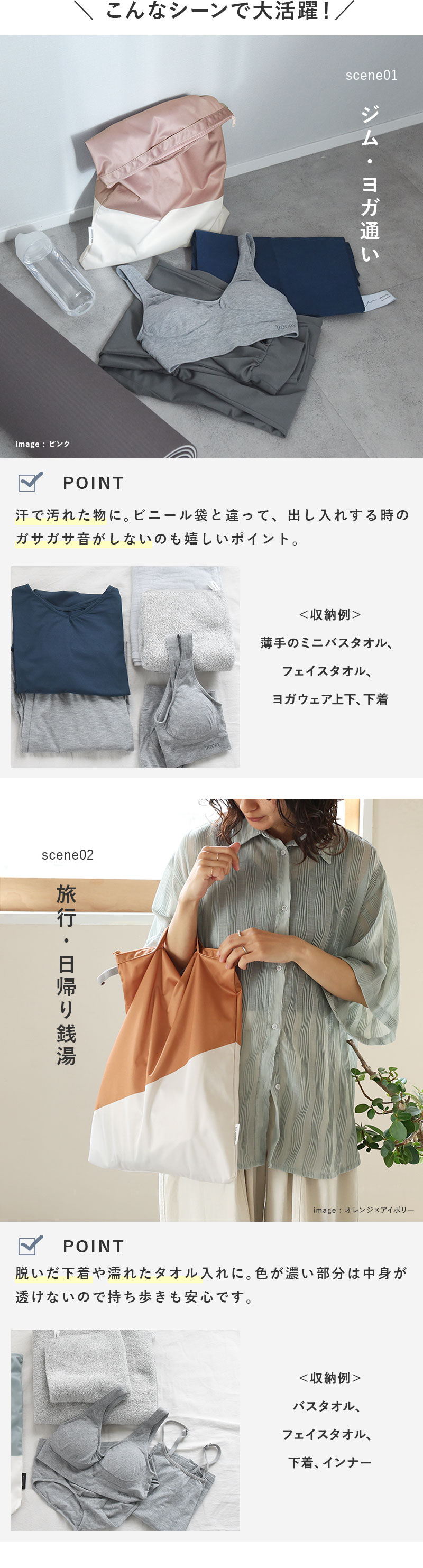 濡れ物だけではなく乾きものも入れられるので、旅行のオーガナイザーして使ってもOK。着用後の洋服を詰めれば、バッグの中を清潔なまま持ち帰れます。