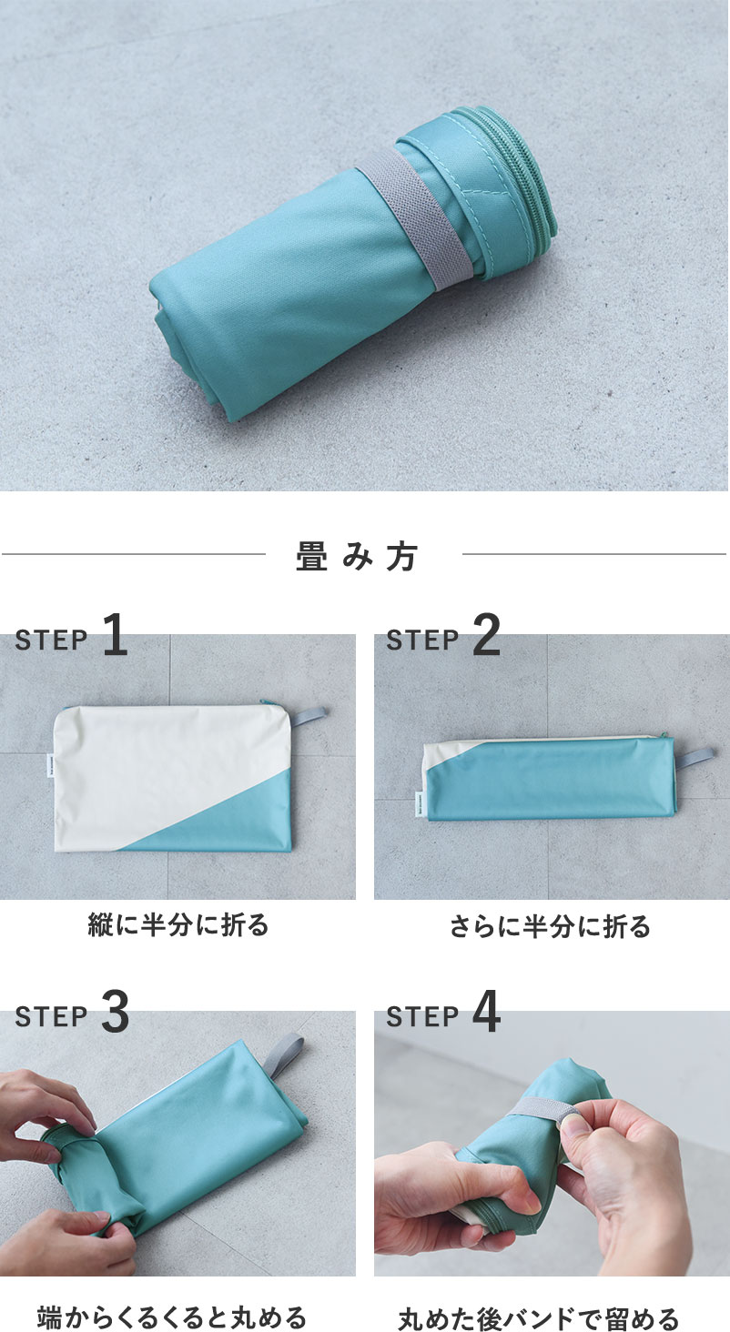 持ち手がゴムバンドになっているので、横に4つ折りした後、くるくる丸めてゴムバンドでまとめれば手のひらサイズに。使わない時の収納がコンパクトになります。