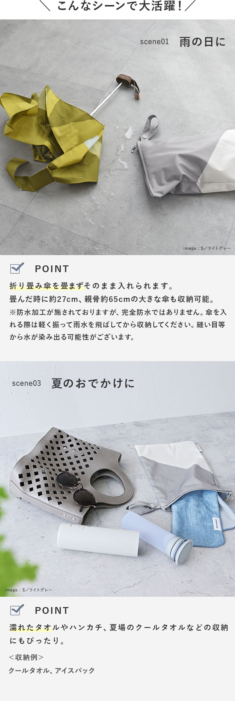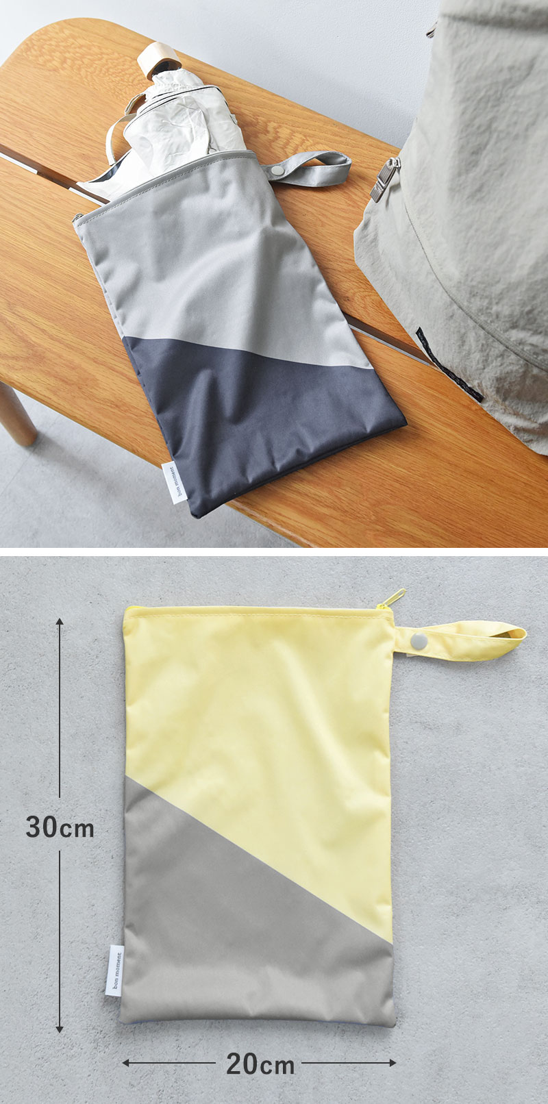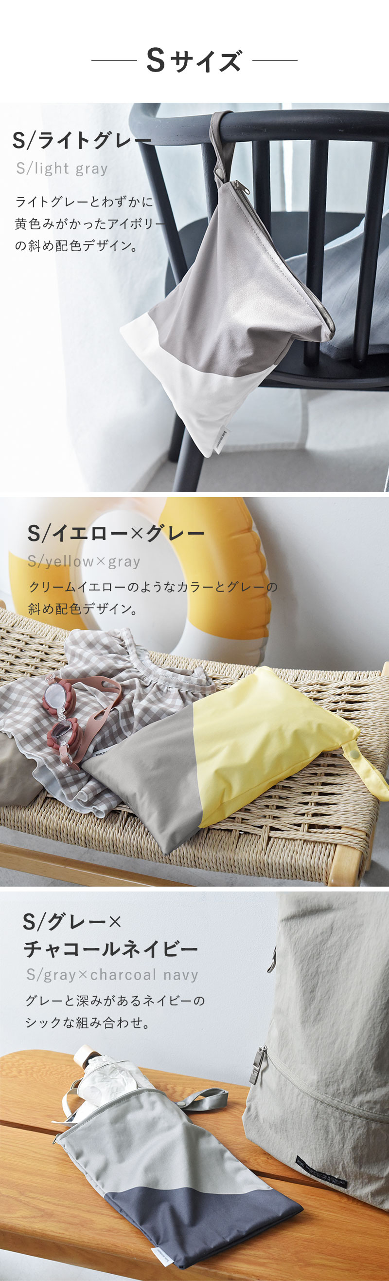 バスタオルが入るくらい大きめMサイズと、折り畳み傘を入れるのにぴったりコンパクトなSサイズの2サイズご用意しています。