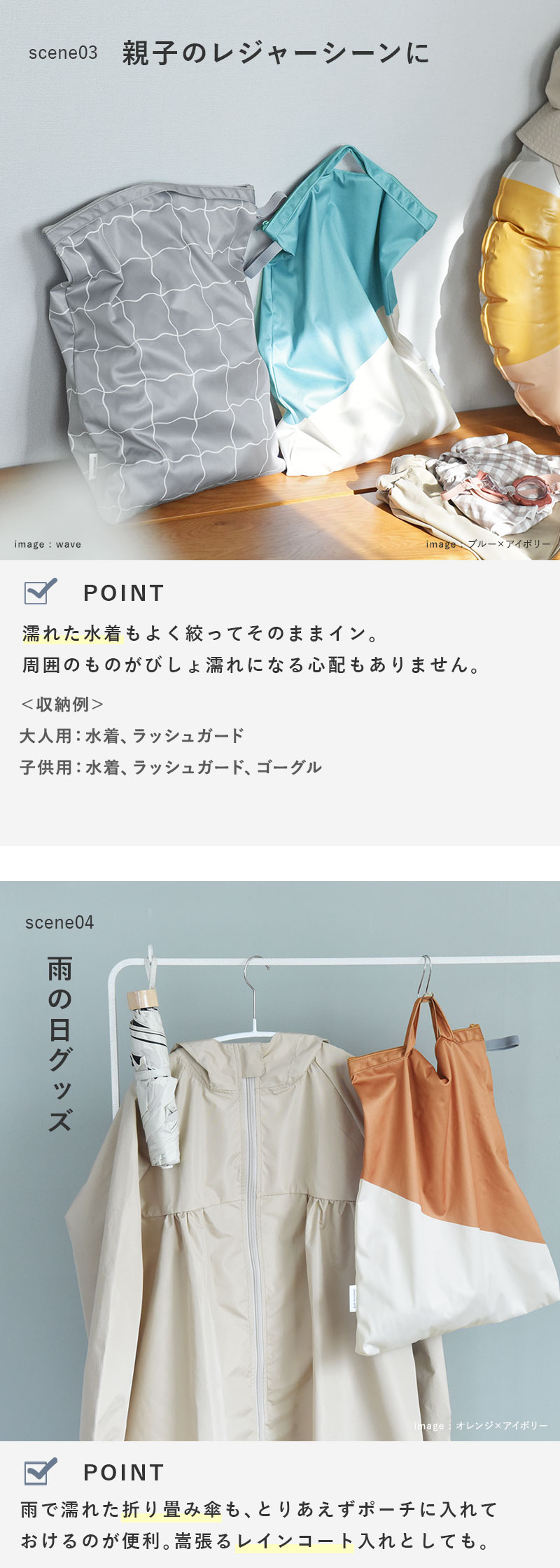 濡れた水着やタオルを持ち運べる防水ポーチ。プールや海のレジャーの他、ヨガ通いや温泉旅行、銭湯など様々なシーンで活躍します。子どもから大人まで使える大きめサイズなのが便利。