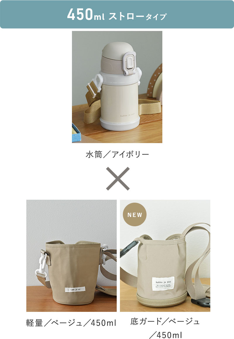 4歳頃~小学校低学年までにぴったりの「600mlサイズ」(直飲みタイプ)に加えて、新たにもう1タイプ、1歳頃~年長さんくらいまでのお子様が使いやすい「450mlサイズ」(ストローボトル)もご用意。