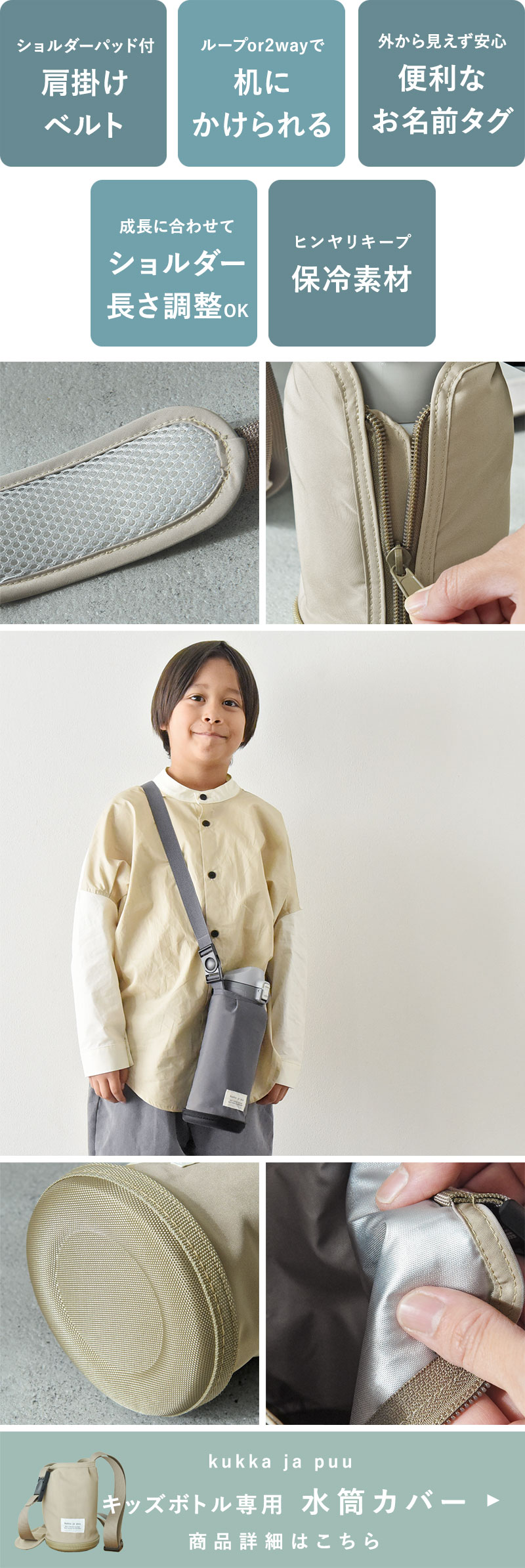 「kukka ja puu ステンレス製 キッズボトル 800ml」の、デザインやカラーリングを損なわないよう、水筒本体とコーディネートできる生地・パーツ色を組み合わせた専用カバー。