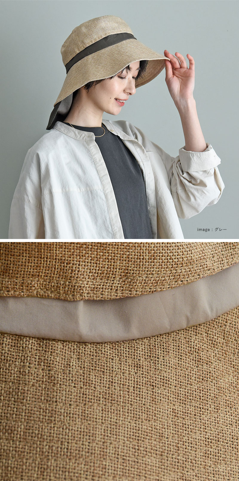 丸洗いできてお手入れ楽ちん「ジュート風ハット」の大人モデル。柔らかな素材で優しい肌触り、また、日よけタレで首筋もガード。親子リンクも楽しめる夏のお出かけハットです。