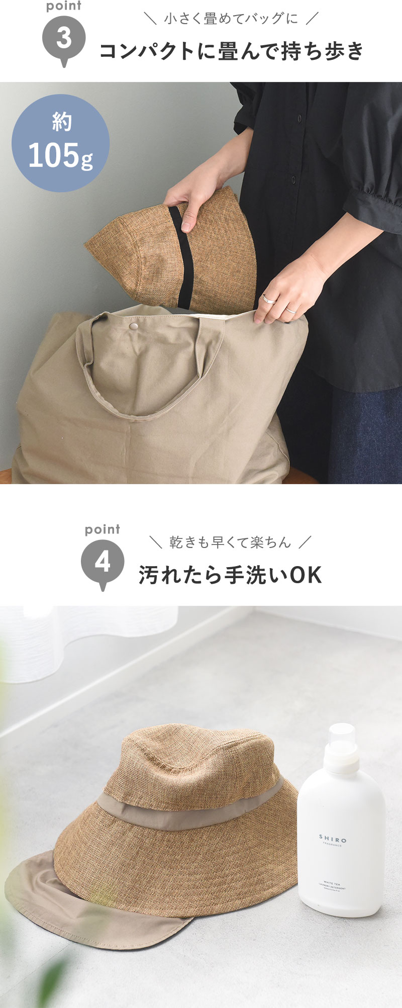 少し長めのツバ(シンプルデザイン/約9.5cm タックデザイン/約10cm)で、真夏の強い日差しをガード。やや下向きのシルエットで、嬉しい小顔効果も。