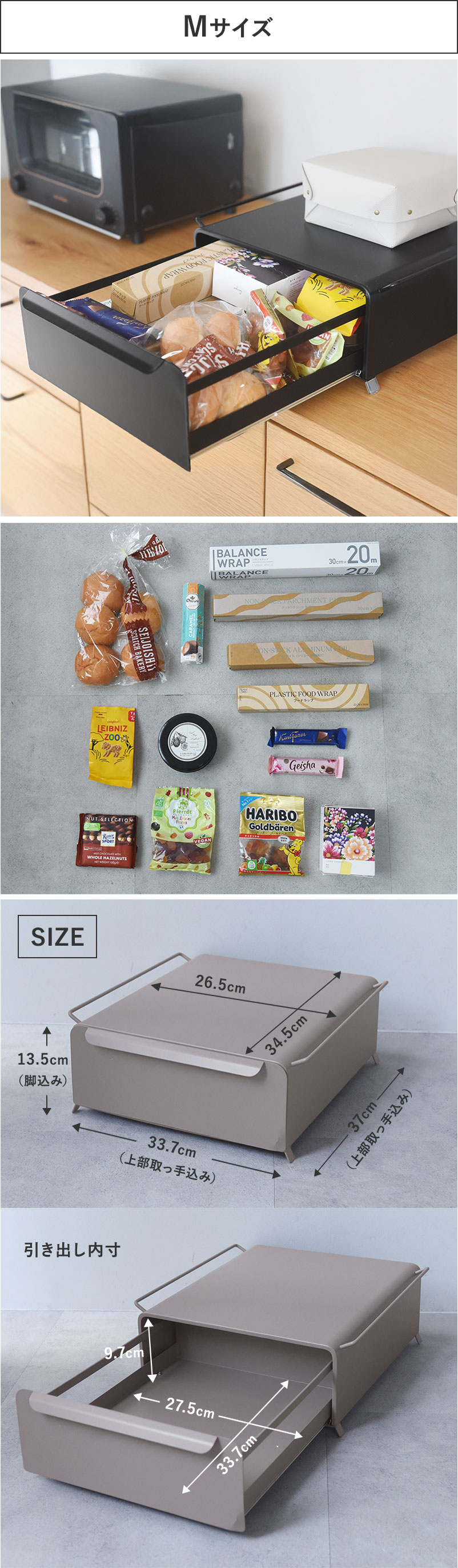 Mサイズは浅めの作りなので、ロールパンなど高さのないパンや、コーヒー、紅茶グッズをまとめても。サランラップやホイルなどキッチンまわりの小物を収納するのにもぴったりです。