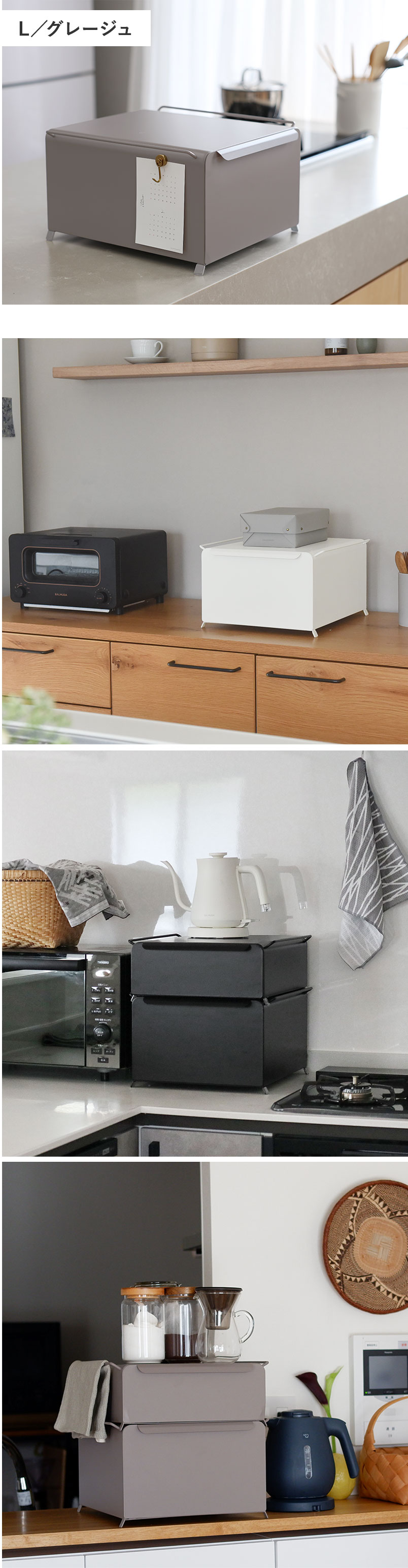 高さを選べる2サイズ展開。天板には、炊飯器やケトル、コーヒーサーバーがちょうどよく収まるサイズ感だから、デッドスペースを活用しながら収納を増やせる一品です。
