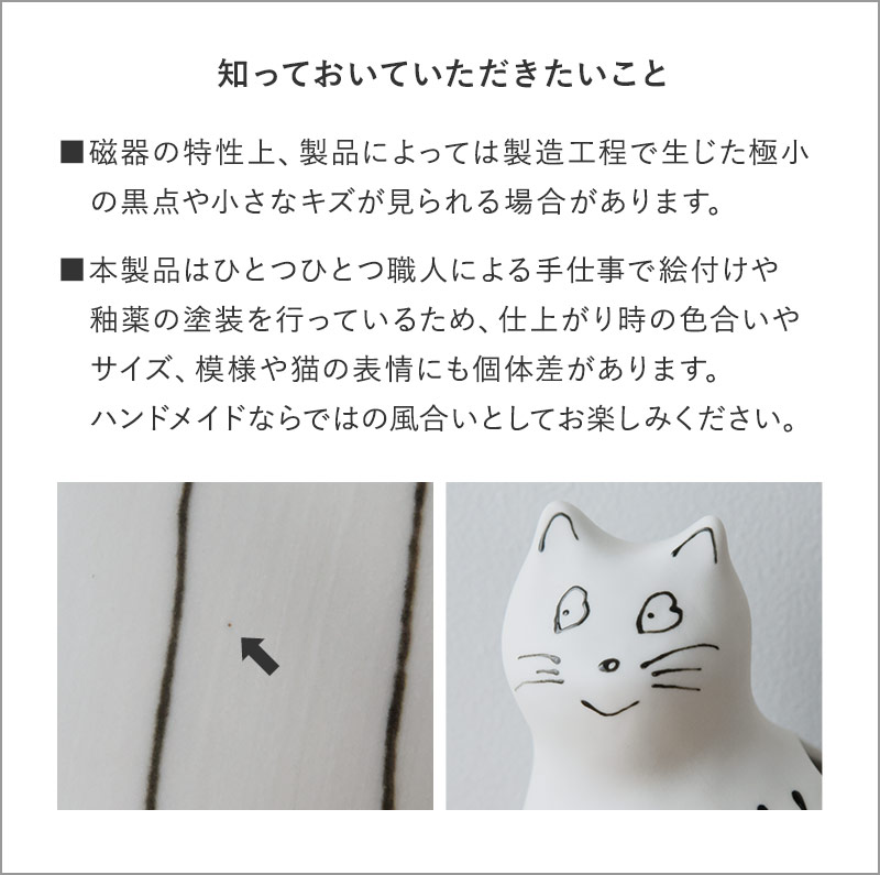 ※本製品はひとつひとつ職人による手仕事で絵付けや釉薬の塗装を行っているため、仕上がり時の色合いやサイズ、模様や猫の表情にも個体差がありますが、ハンドメイドならではの風合いをお楽しみください。