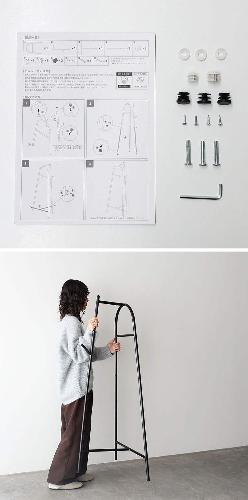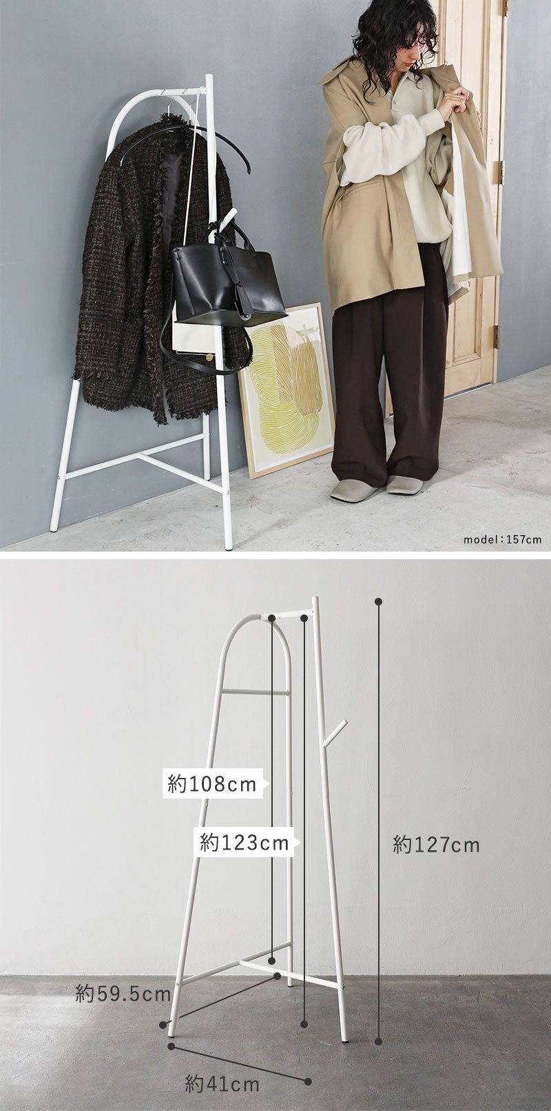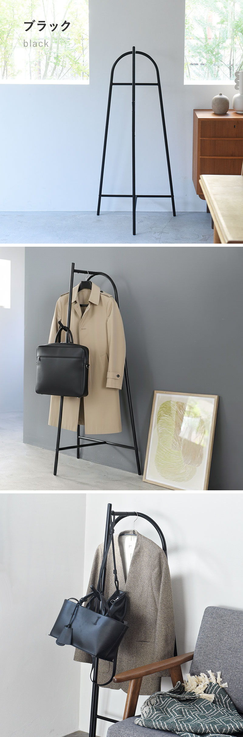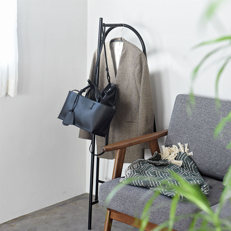 圧迫感のないサイズ感で、部屋の隅やリビングにもすっきり。何も掛けていなくても絵になり、たっぷり掛けても美しい佇まい。毎日にちょうどいいコートハンガーです。