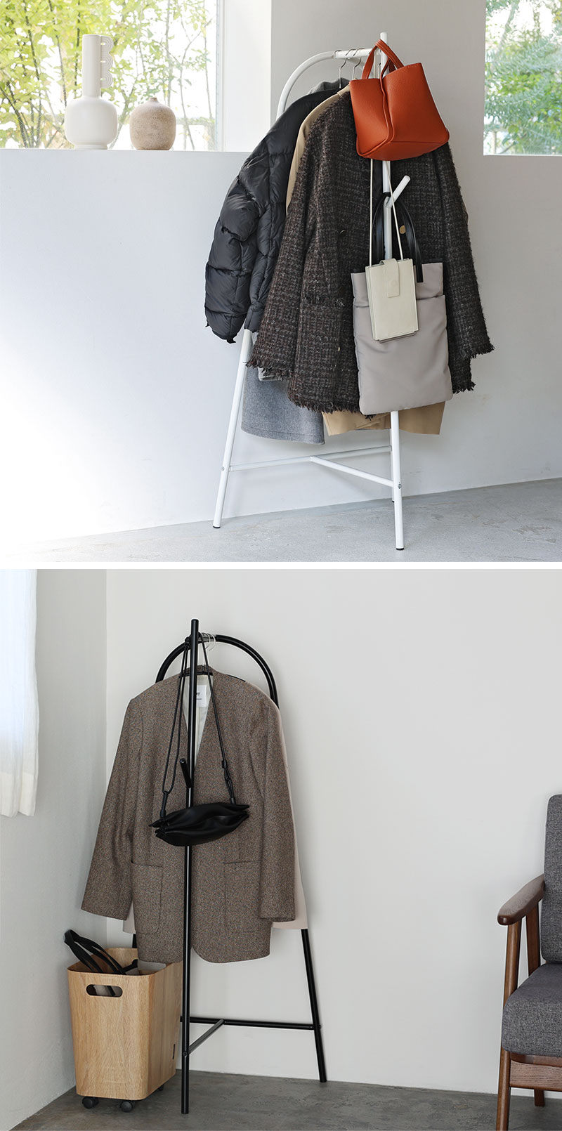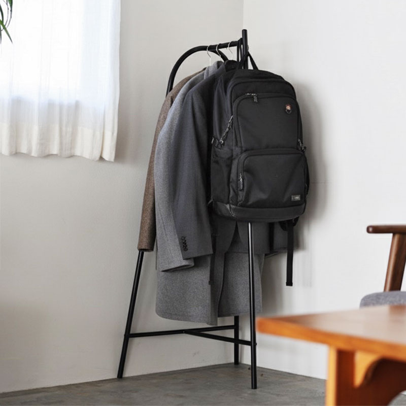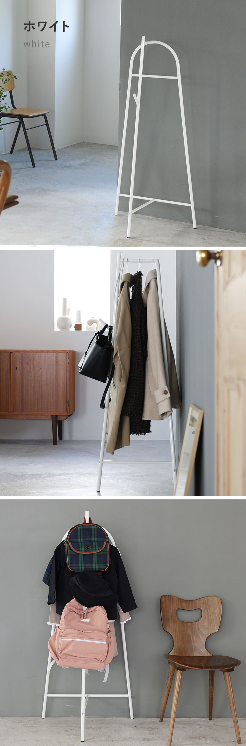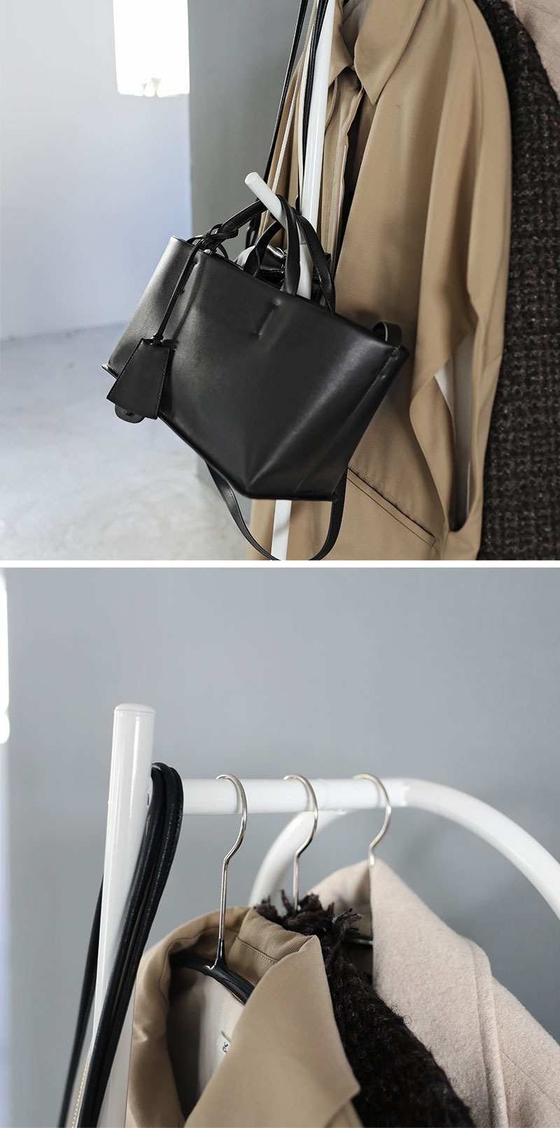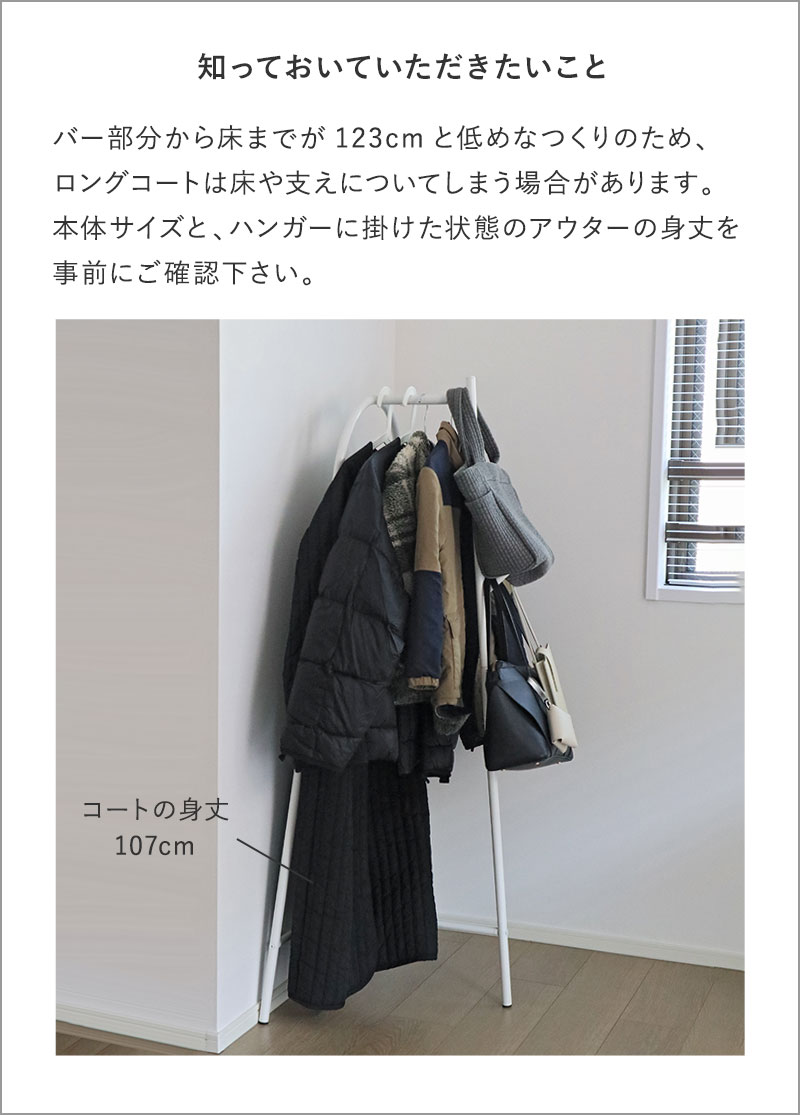 コンパクトながら、ショート丈やミドル丈のアウターが4~5着と、バッグ1~2個を同時に掛けられる、充分な収納力。