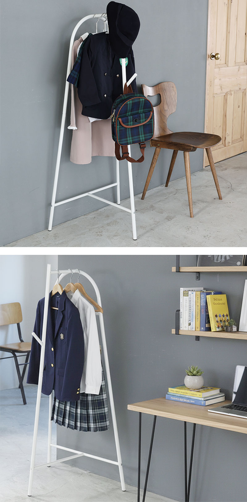 - コンパクトに置ける小ぶりなハンガーラック。ミドル丈~ショート丈のコートにちょうど良いので、幼稚園や中学高校の制服、スーツをかけるのにぴったりです。