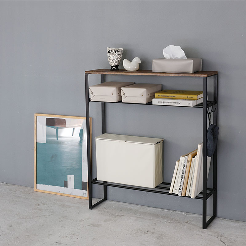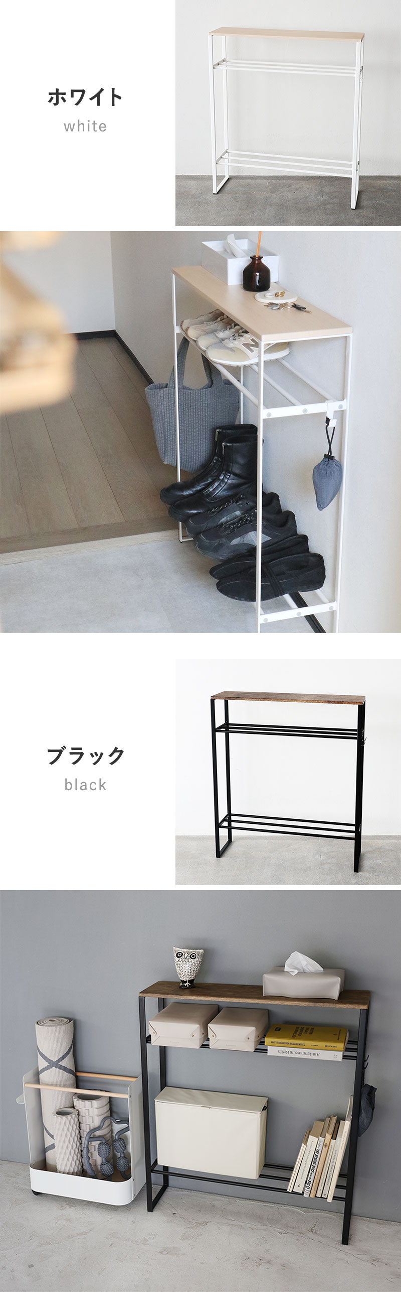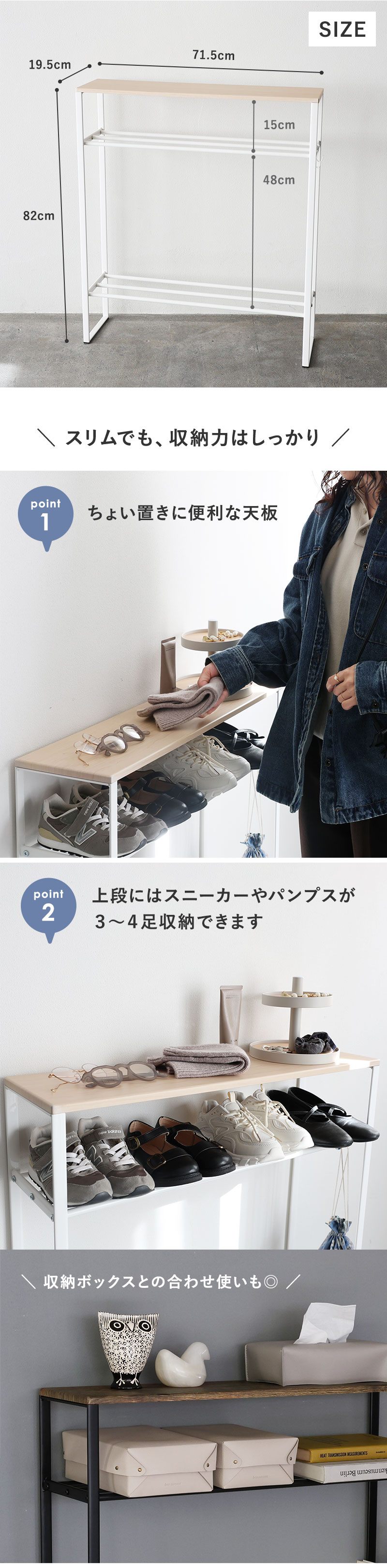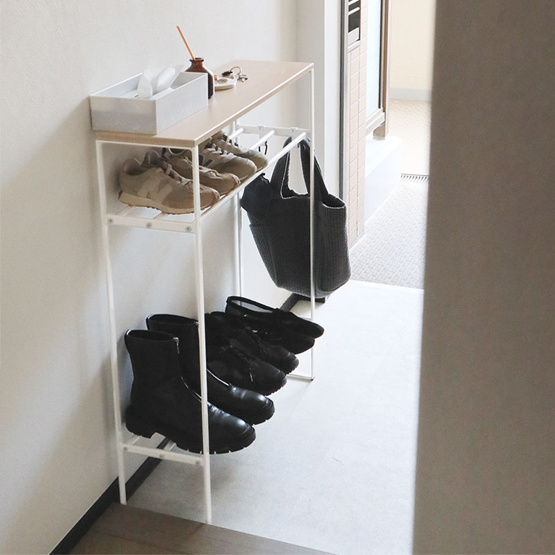 奥行はたったの19.5cmで、手狭な玄関や廊下にもなんなく置けるスリムシェルフ。収納ラックなどを置きたいけれどスペースがない、そんな時にも◎。通り道をふさがないお助けアイテムです。