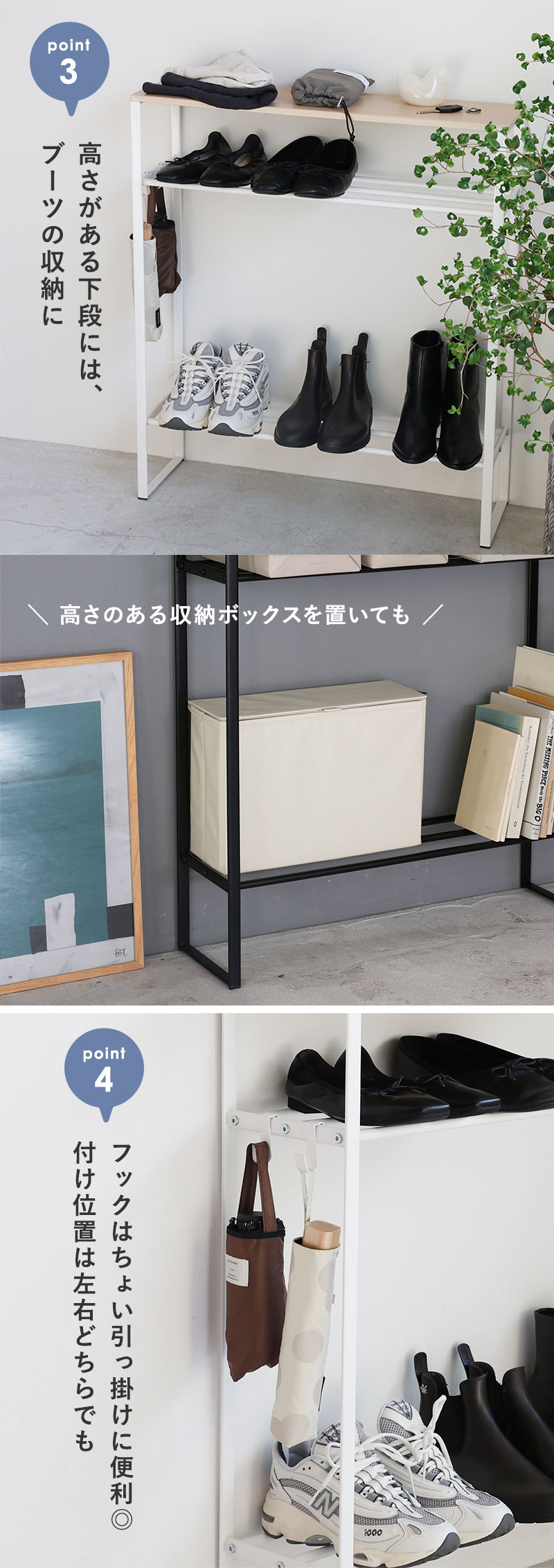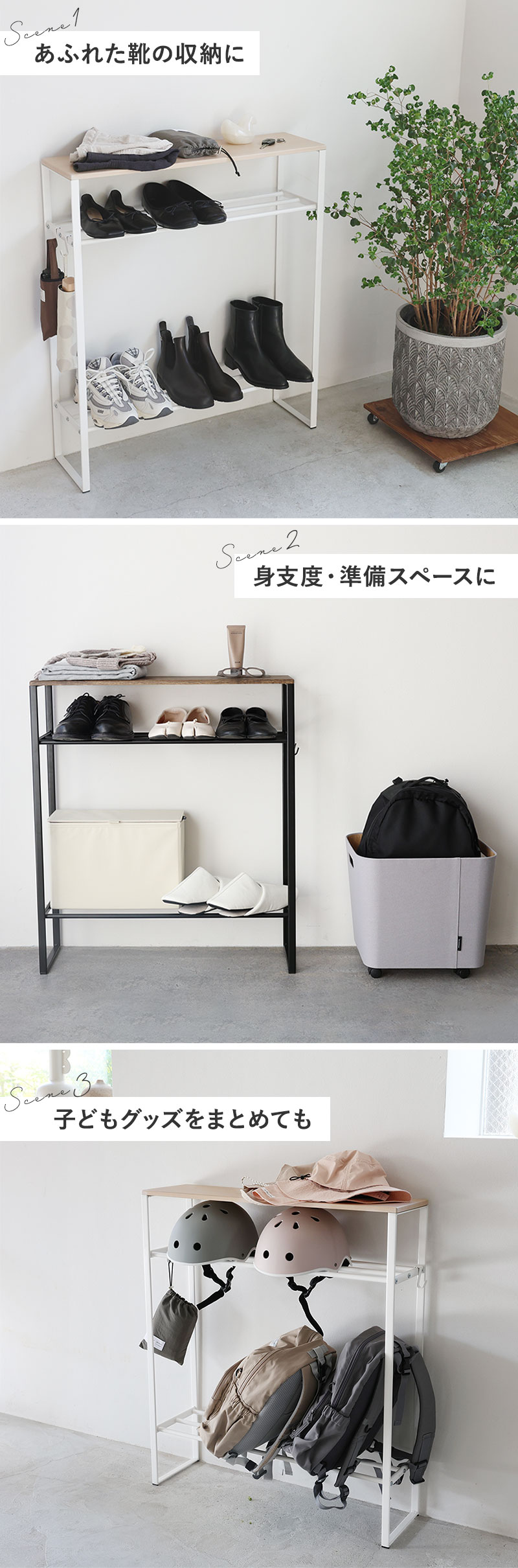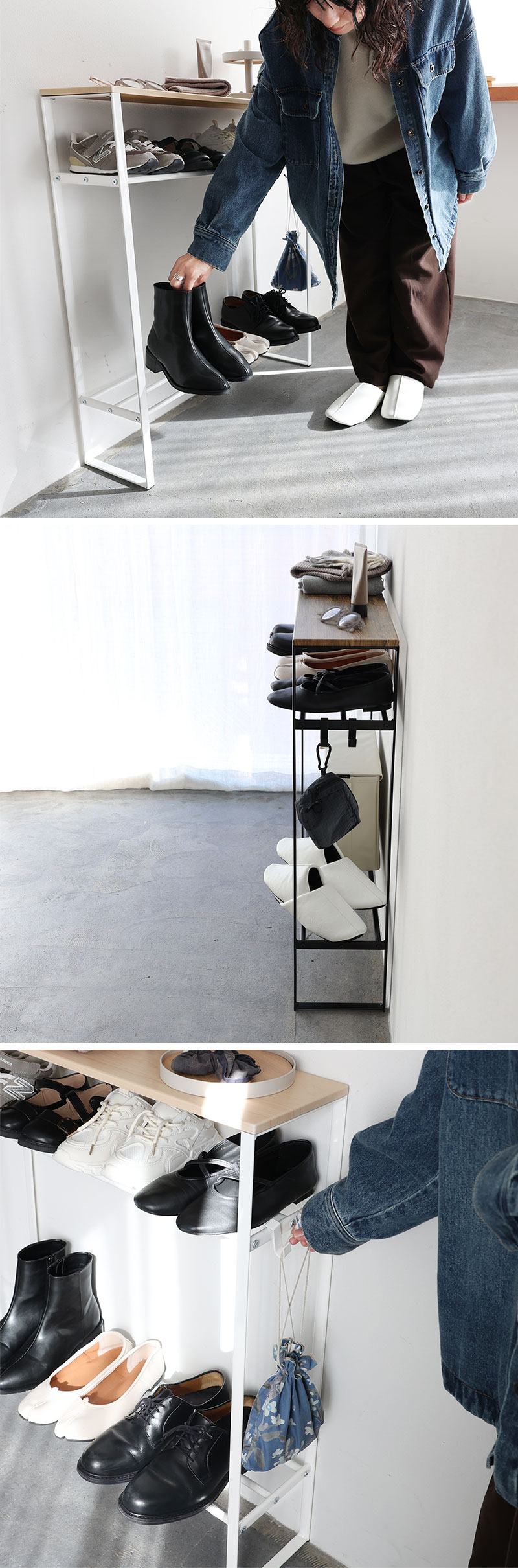 木目調の天板に加えて、2段の棚が付いているので靴もずらりと並べておけます。