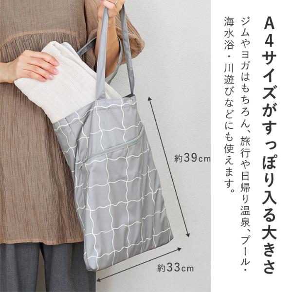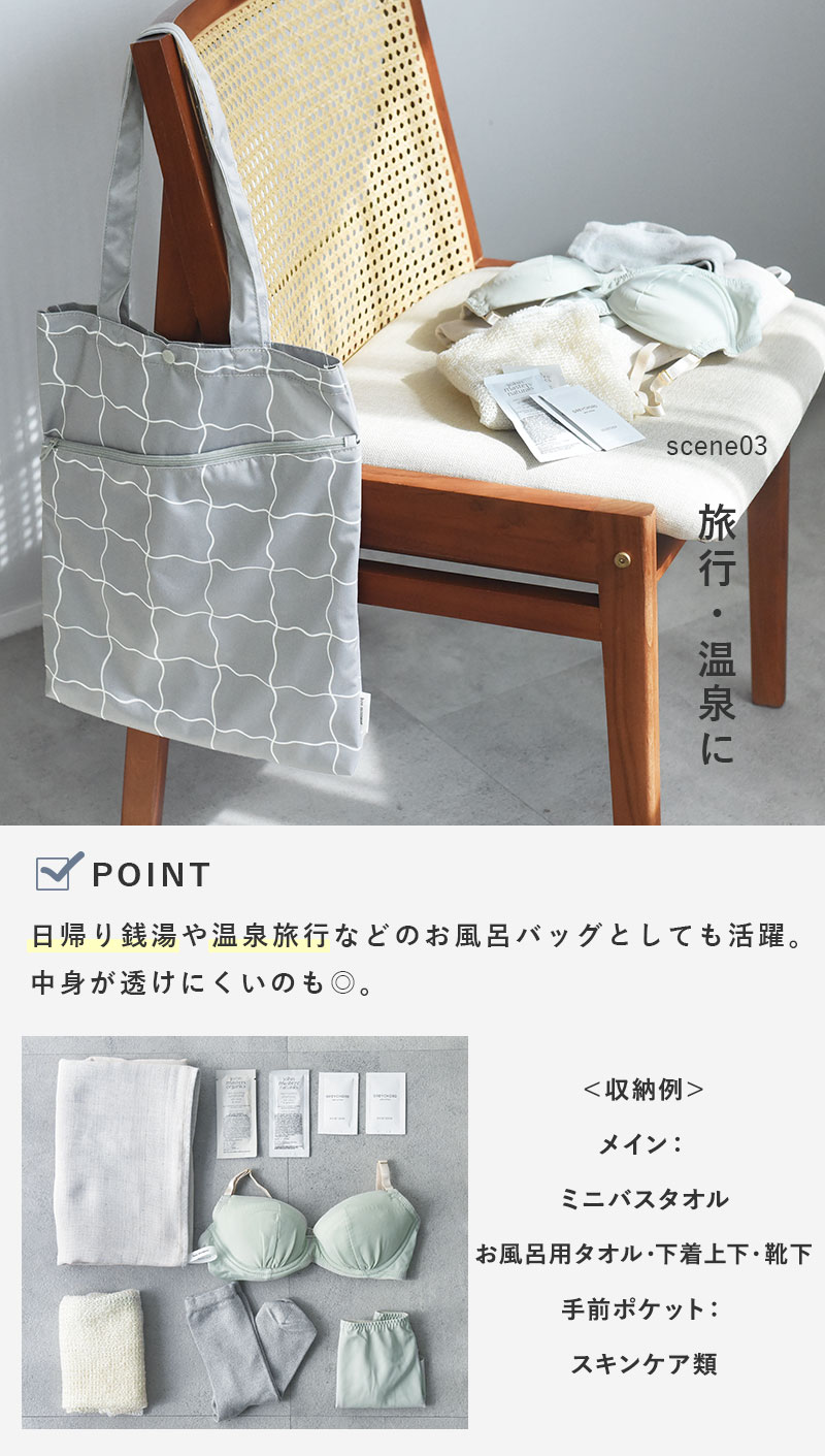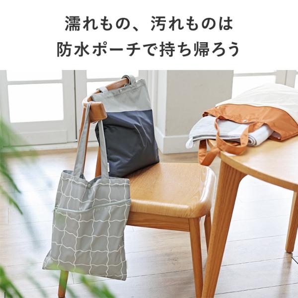 濡れた水着やタオルを持ち運べるトート型の防水ポーチ。プールや海のレジャーの他、ヨガ通いや温泉旅行、銭湯など様々なシーンで活躍します。肩掛けできてさっと持ち歩けるのも魅力。