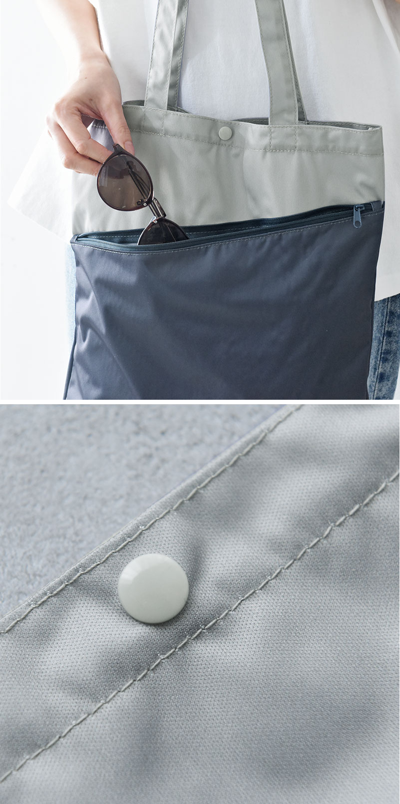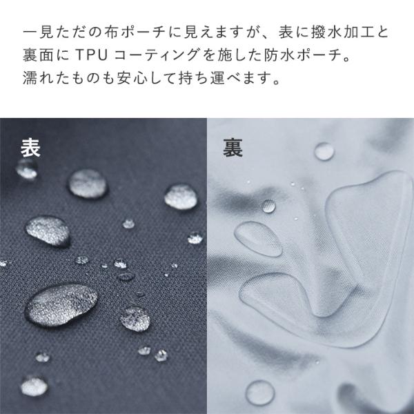裏面に防水性に優れたTPUコーティングをして、表に撥水加工を施した仕様。濡れたものや汚れものを安心して持ち運べます。