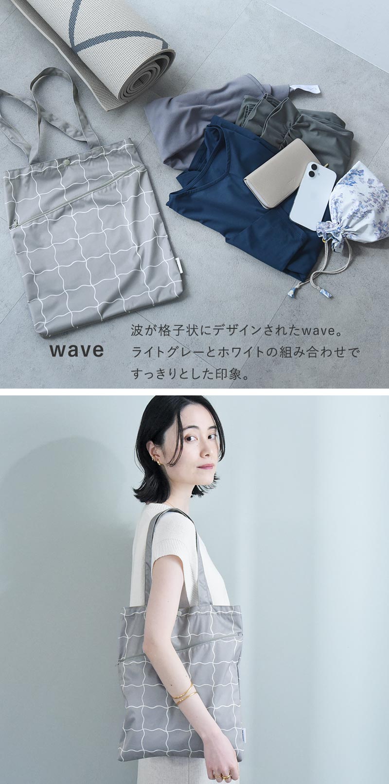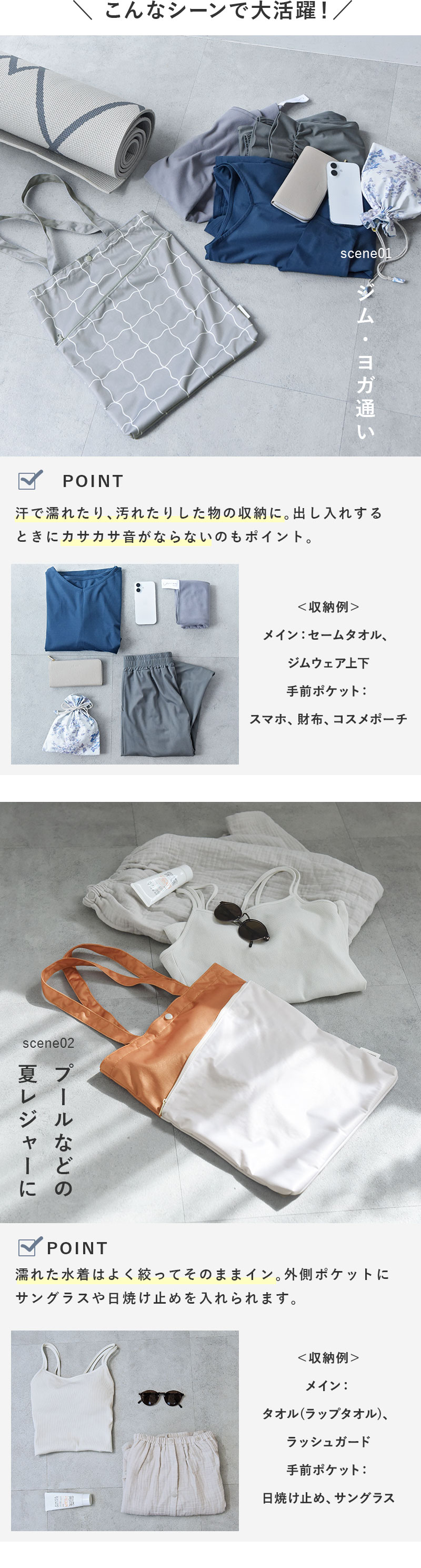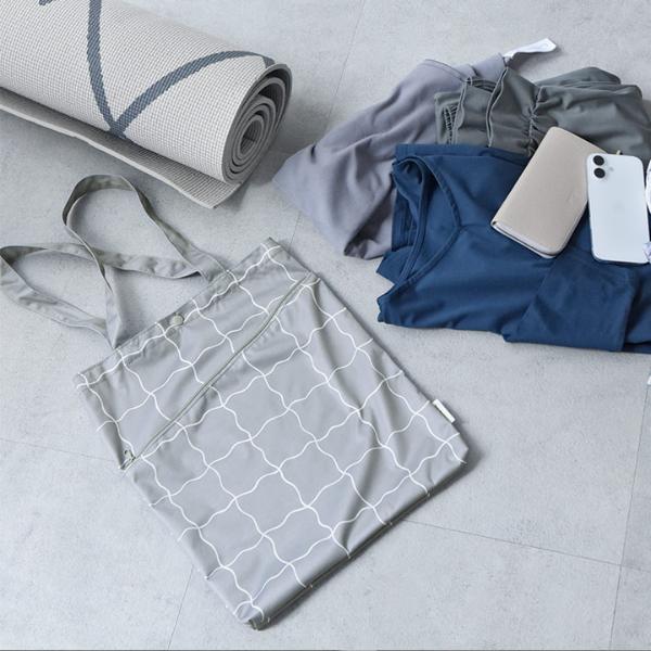 ジムやヨガはもちろん、旅行や日帰り温泉、プール・海水浴・川遊びなどのレジャーシーンにも使いやすいよう、縦39cm×横33cmのたっぷり収納できるサイズ感に仕上げました。