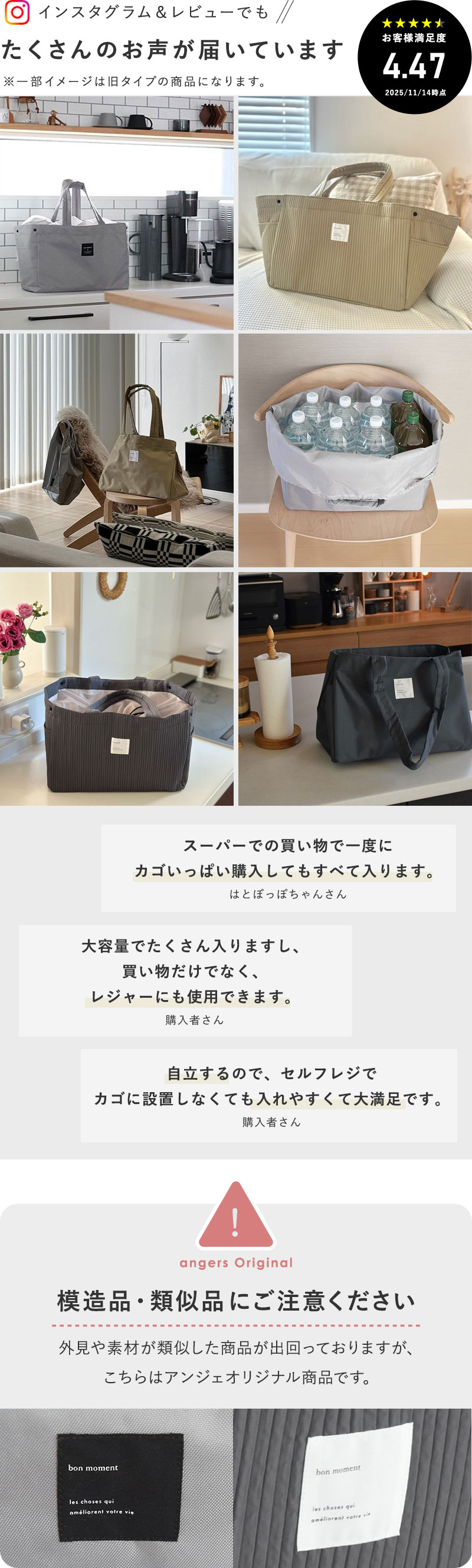 ロングセラーの買い物かごバッグシリーズに、大容量の「Lサイズ」が仲間入り。一般的な買い物カゴがまるっと入るサイズ感なのでMyカゴ派さんにも◎です。