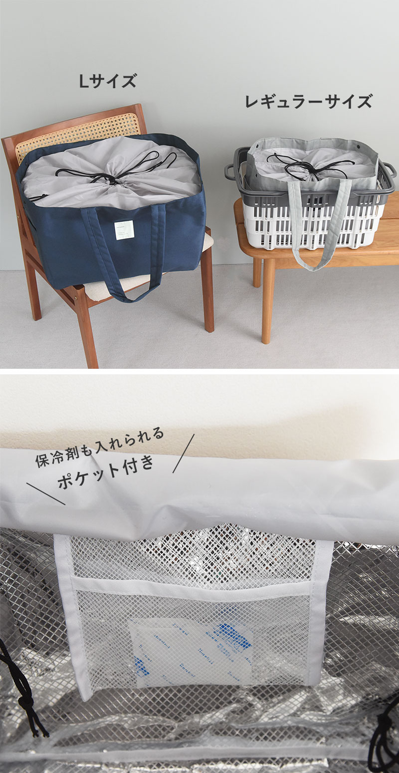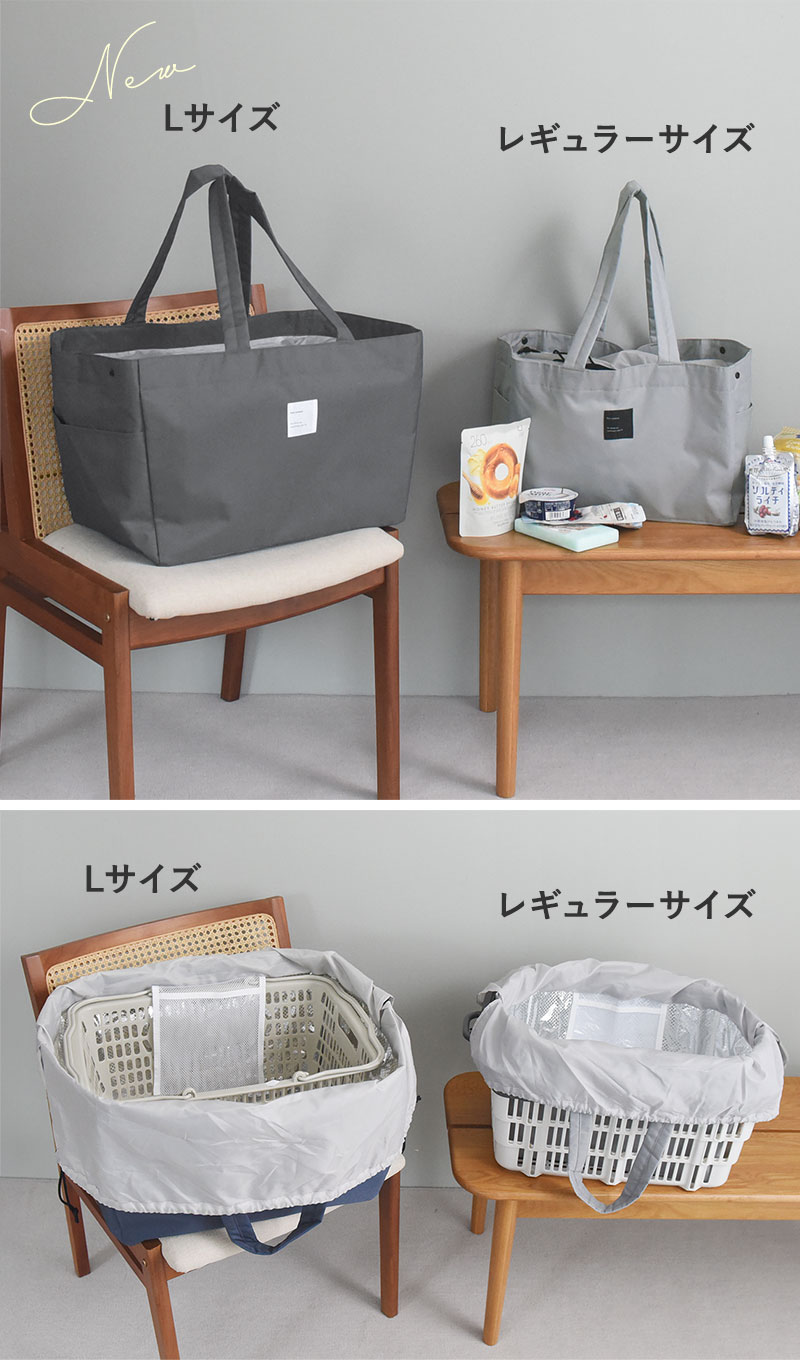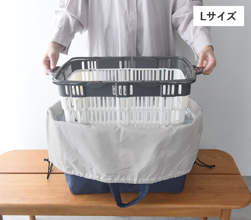 大容量の2サイズスーパーのカゴにぴったりフィットする、マチのある大容量のバッグです。カゴに収まるレギュラーサイズと、カゴをまるっと入れられるLサイズの2サイズ展開。口部分は巾着仕様なので、たくさん物を詰めても溢れず、目隠しとしても活躍します。