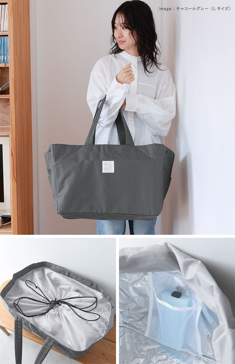 自立する理由は、薄手のエコバッグとは違う、しっかりとした素材感だから。さらに内側は保冷素材なので、冷蔵食材も安心して持ち運べます。また、買い物カゴにピッタリはめやすいエコバッグは、お店によってはお会計時に、店員さんが袋詰めしてくれるところも。毎日の家事を少しラクにしてくれる、心強い味方です。