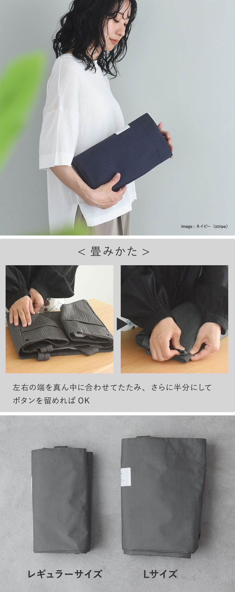 使わないときはコンパクトに小さくたたんでスナップボタンで留めれば、持ち歩くときや使わない時もコンパクトに。