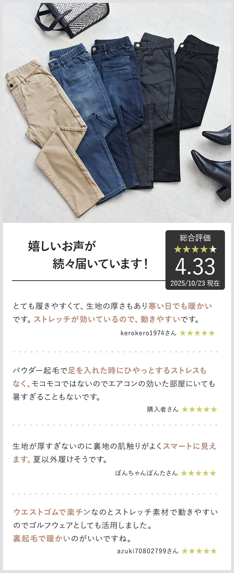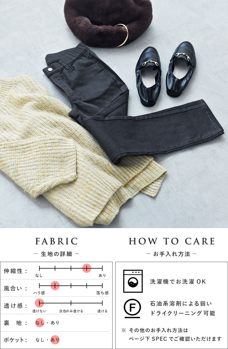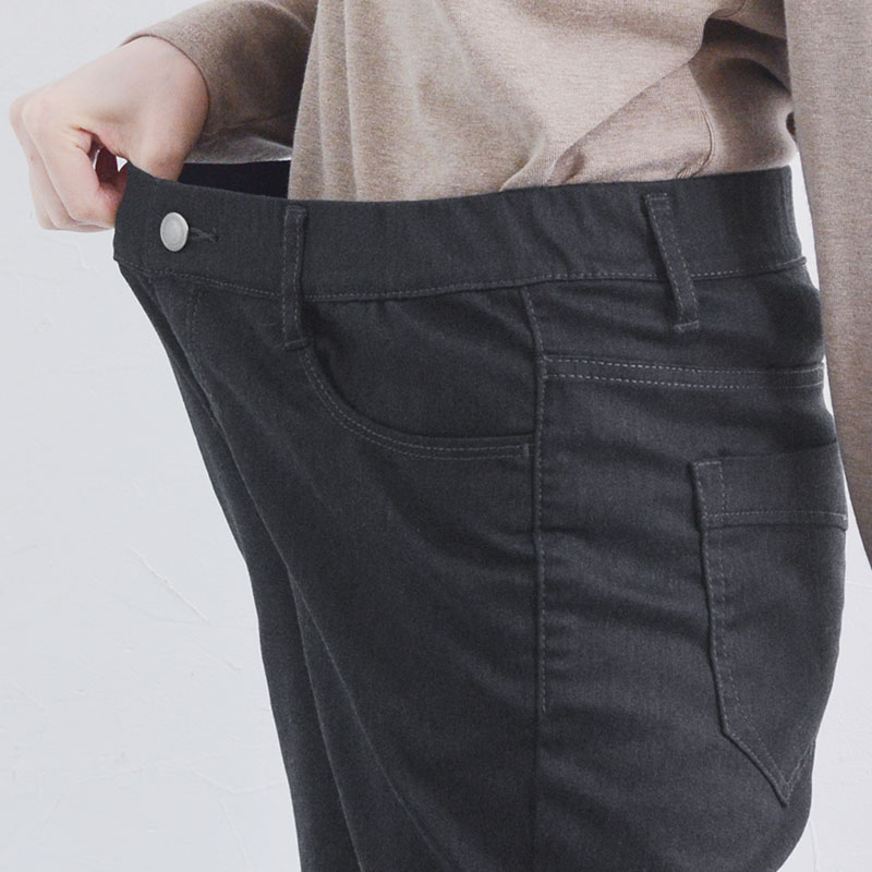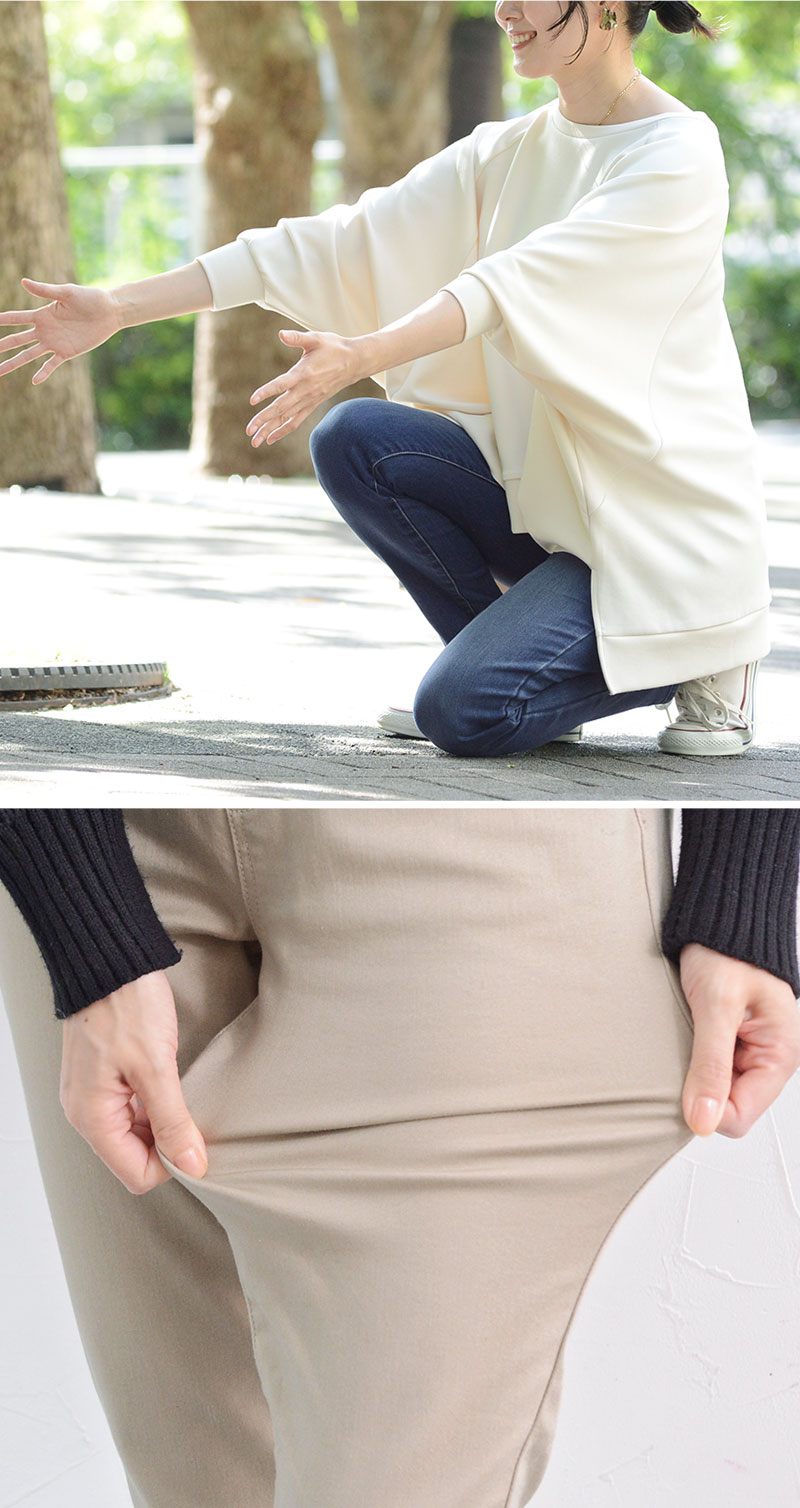 股上も深く、しゃがんでも背中が見えなくて安心。肌がむき出しになって寒くなるようなこともありません。気軽に履けてずっとストレスフリーでいさせてくれる1本です。
