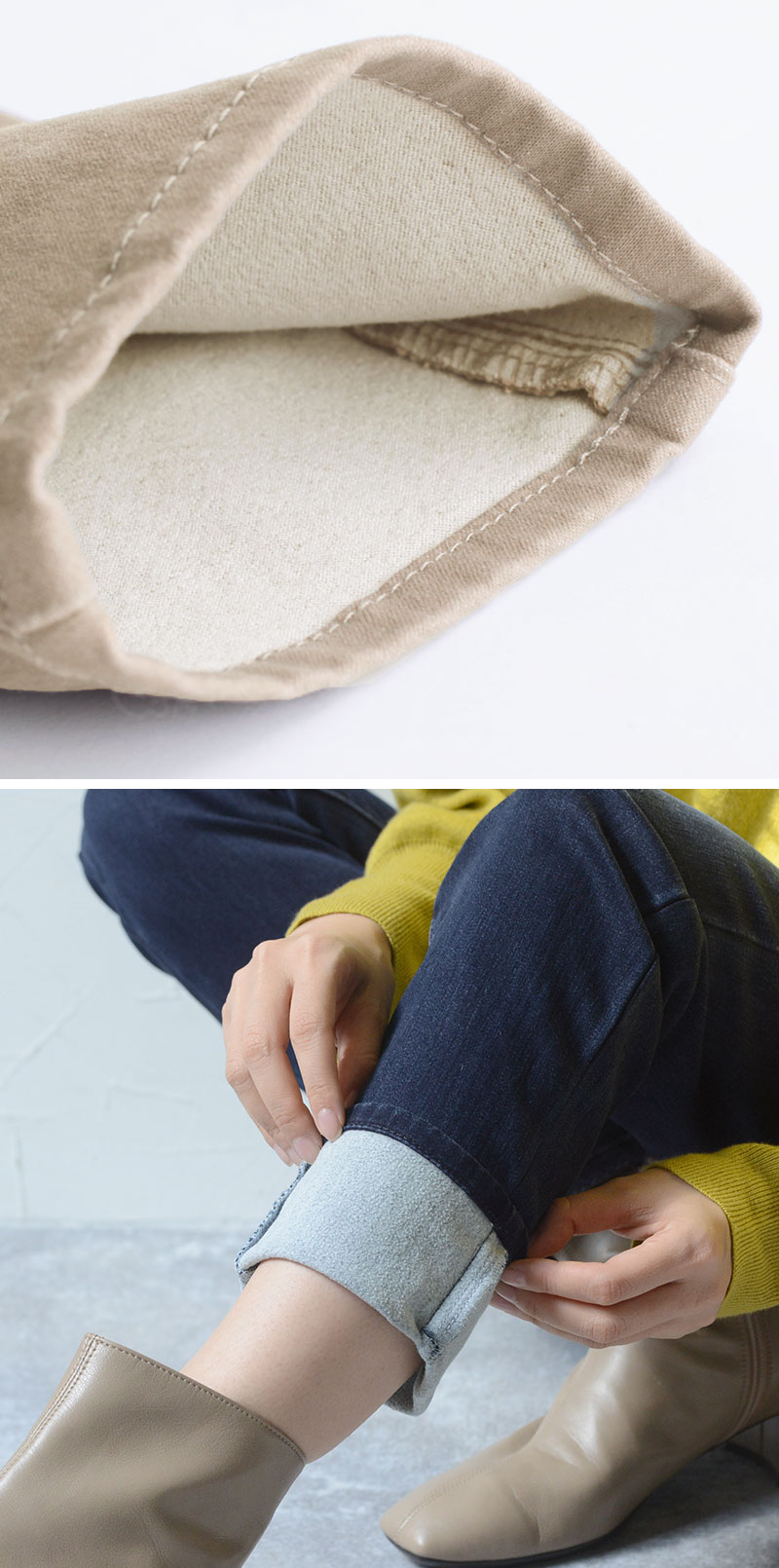 冬の休日、ちょっと出かける時に、サラッと履ける。裏側にパウダー起毛の素材を合わせた、あったかパンツの出番です。