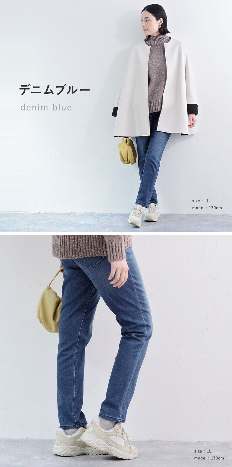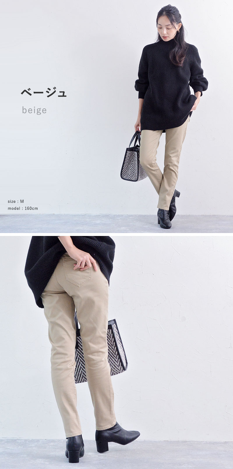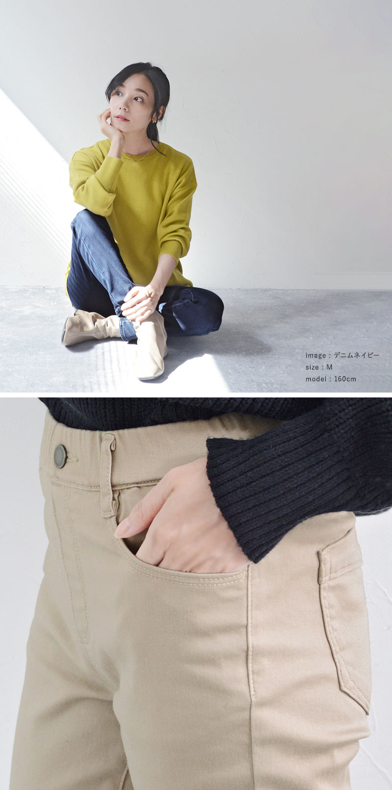 ベージュ・デニムネイビー・デニムブルー・ブラック/綿65%、ポリエステル33%、ポリウレタン2%