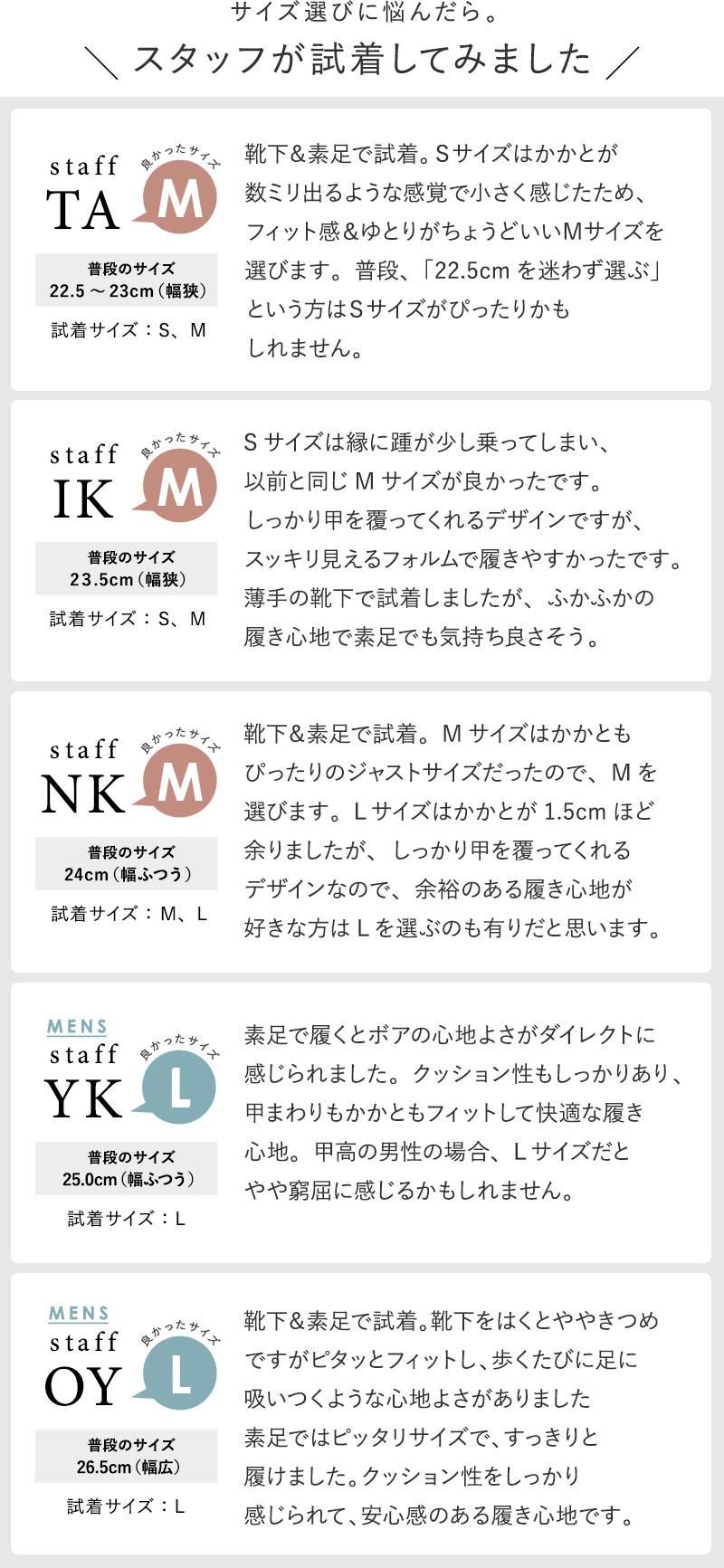 01:すっきりシルエット&しっかり暖かいかかとがなく、あえてフィット感の高い細身シルエットに仕上げることで、足元を綺麗に見せてくれるデザインに。暖かな履き心地と、すっきり見えを両立しています。