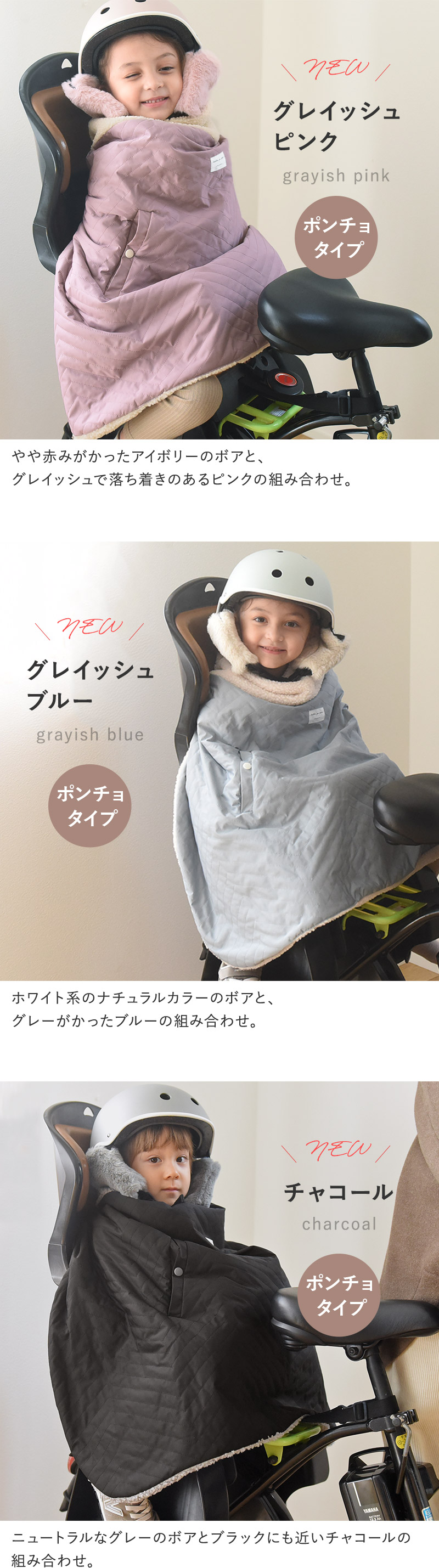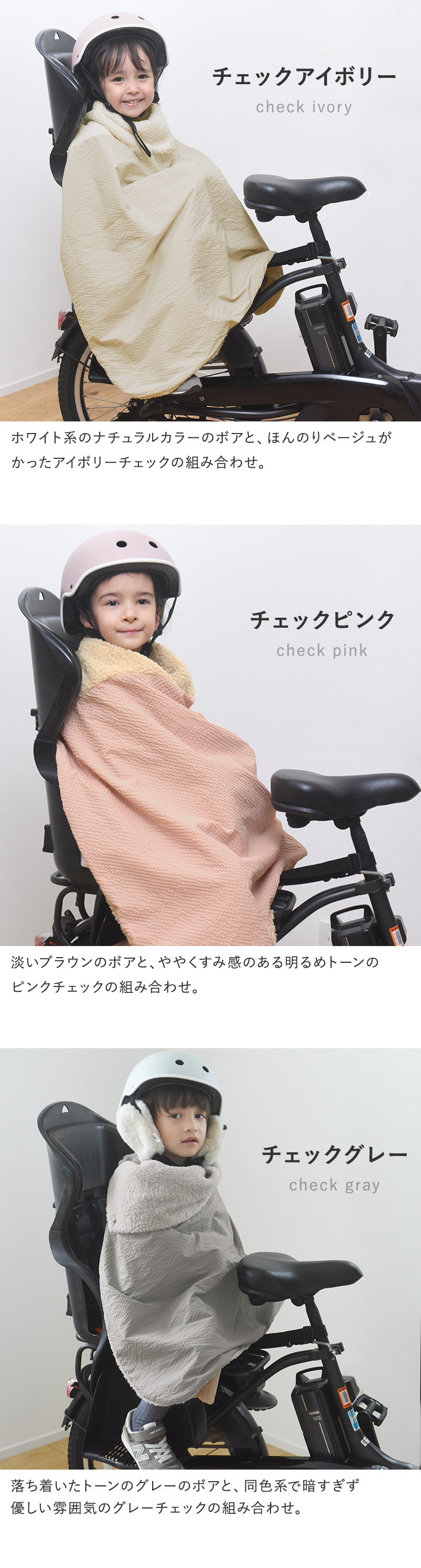 着たまま過ごせるポンチョ自転車から降りたあとも着たままでOK、アウター感覚でお過ごしいただけます。スリットから手を出すことができるので、自転車の乗り降りも安心、そのまま手をつなぐことも。