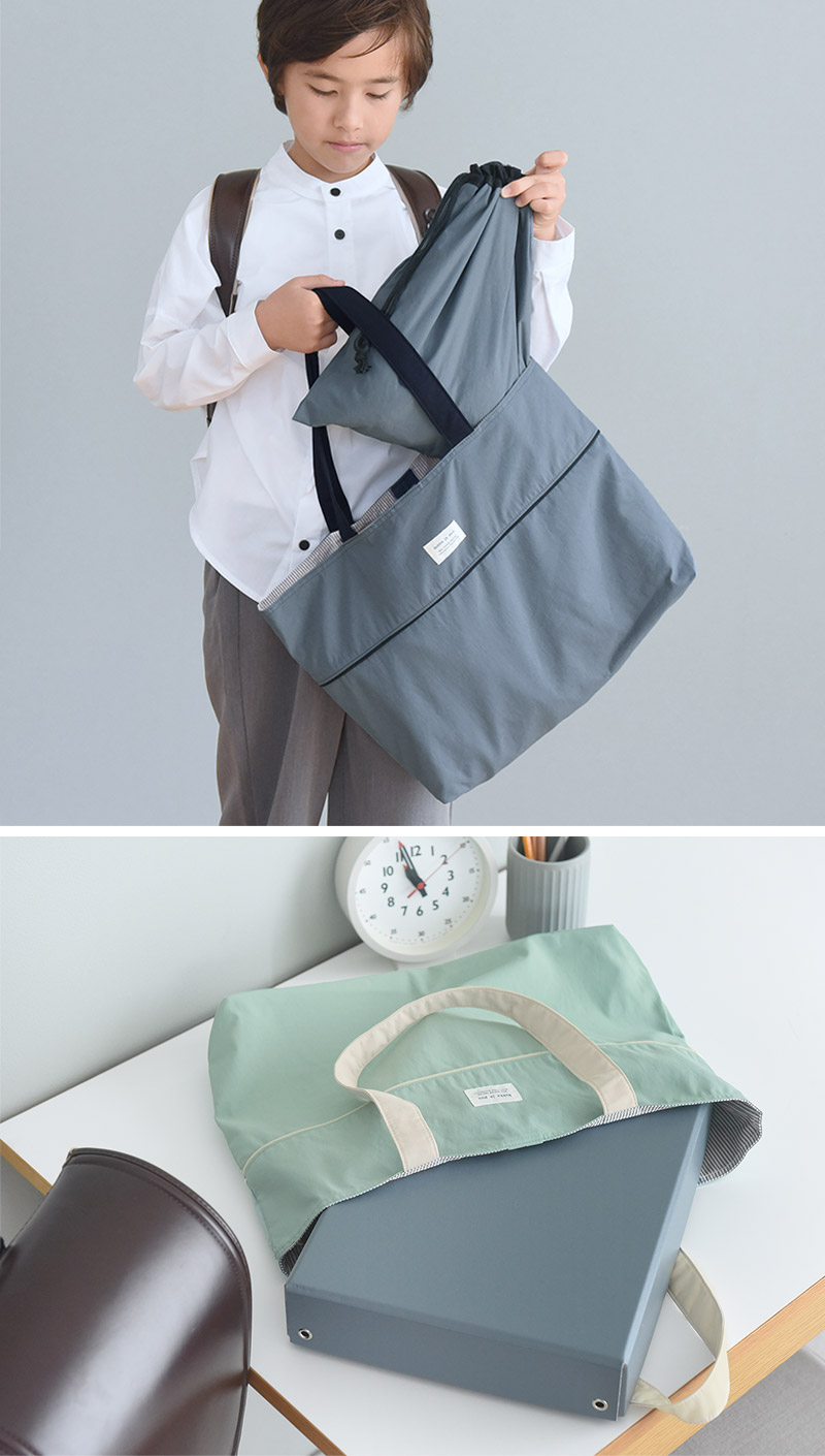 お道具箱もすっぽり入るサイズ感だから、大荷物のキッズたちに◎。体操服、上履きなど持ち帰りが多い週末も、これならひとつにまとめて入れることができます。また、引っかけループ付きで、机の横にかけても床に付かないという工夫も。