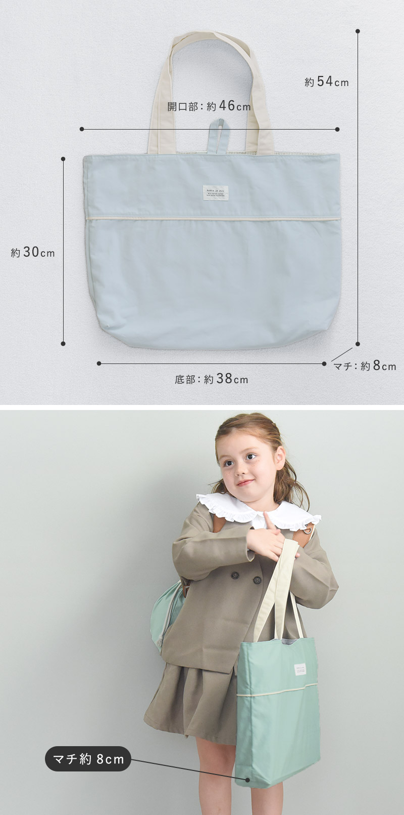 収納部分は縦30×横38cm、そしてマチ幅は8cm。厚みのあるお道具箱を入れるのはもちろん、体操着と上履きをひとまとめにして持ち運ぶこともできます。