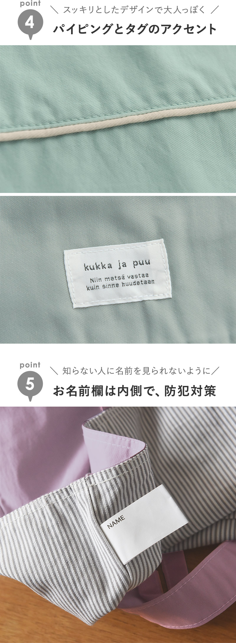 正面には、「花と木のようにすくすく元気に育って欲しい」という思いを込めたkukka ja puuのタグが、アクセントになっています。