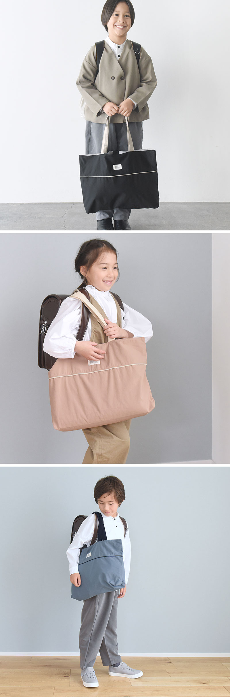 一年生だとたっぷり入れたバッグをランドセルを背負って肩にかけるのは難しいようで腕にかけて歩いてますが、少し持ちにくそうな時もあります。