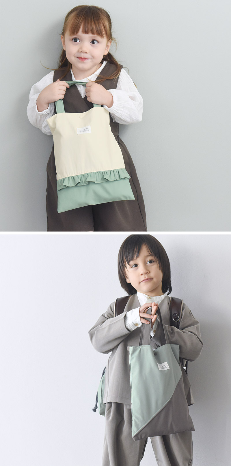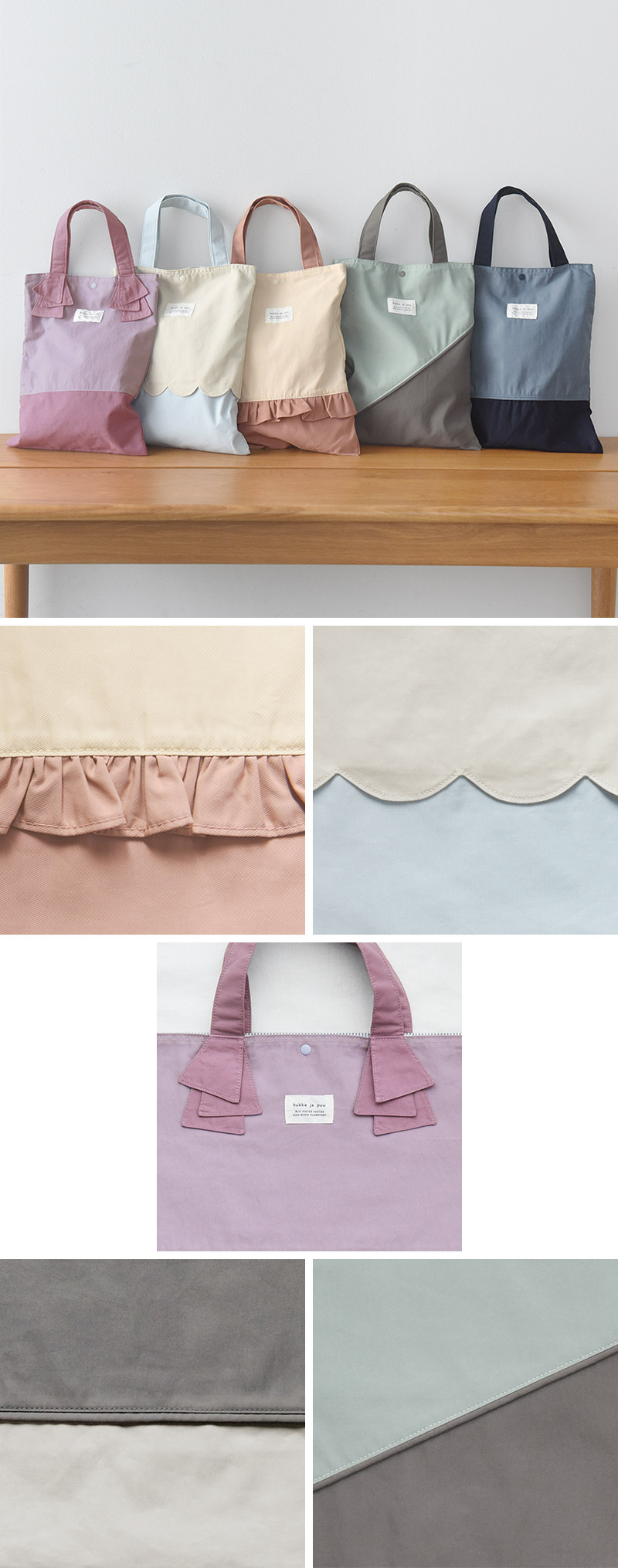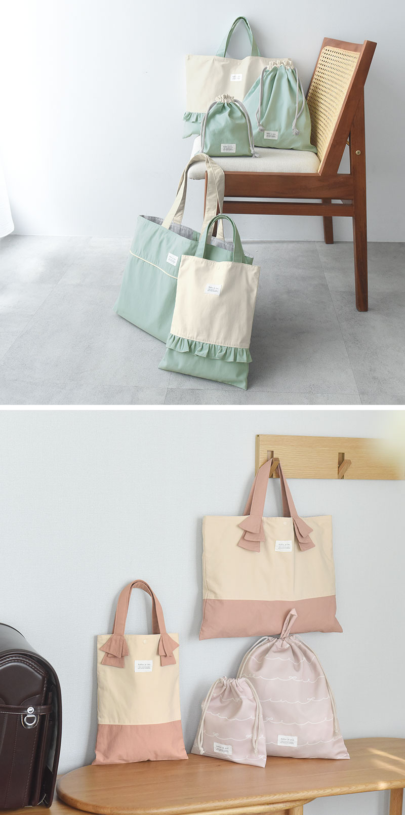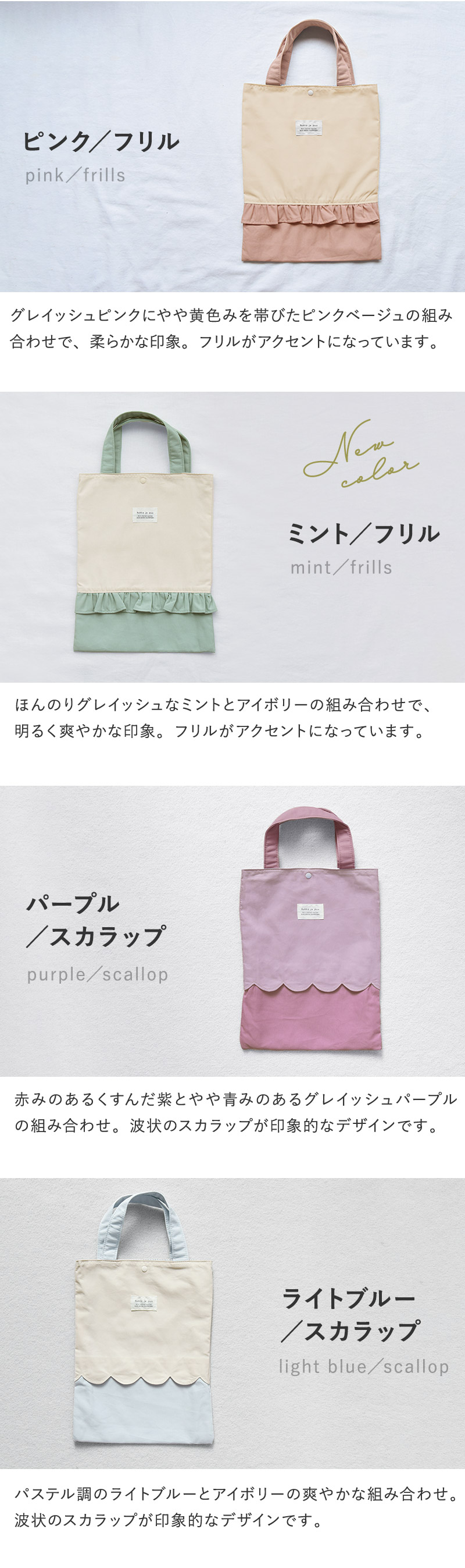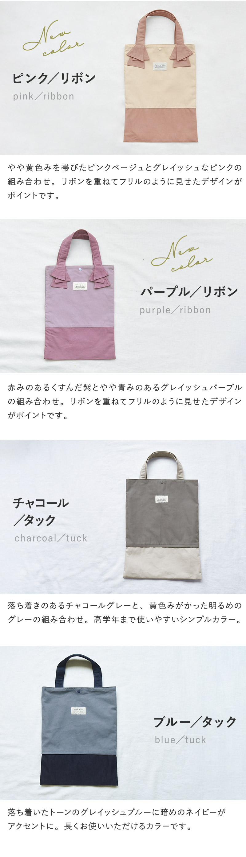 表地はニュアンスカラー、裏地はボーダー柄をあわせて北欧テイストの仕上がりに。フリルにスカラップ、シンプル無地など5つのデザインを展開、高学年まで使える大きめサイズもご用意しました。