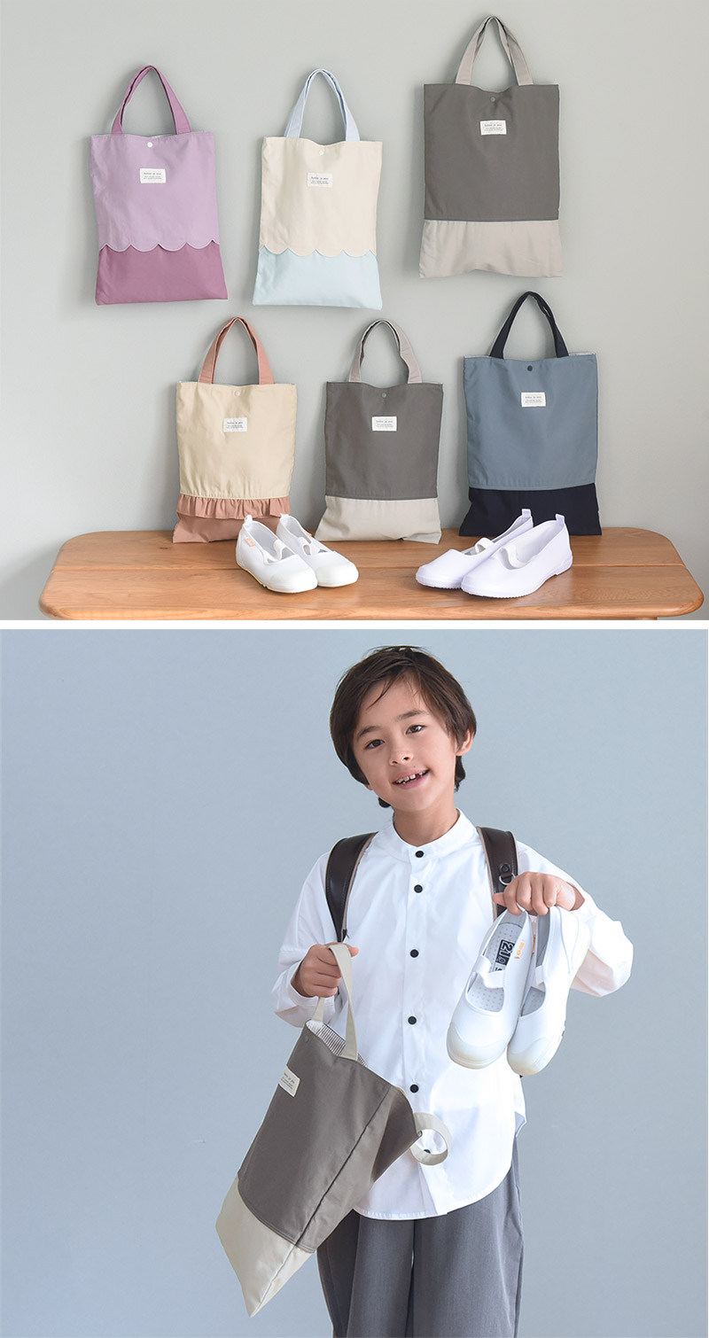 - 落ち着いた北欧カラーの「シューズバッグ」。フリルやタックをあしらった大人かわいいデザイン。男の子も女の子も選べるカラー展開です。