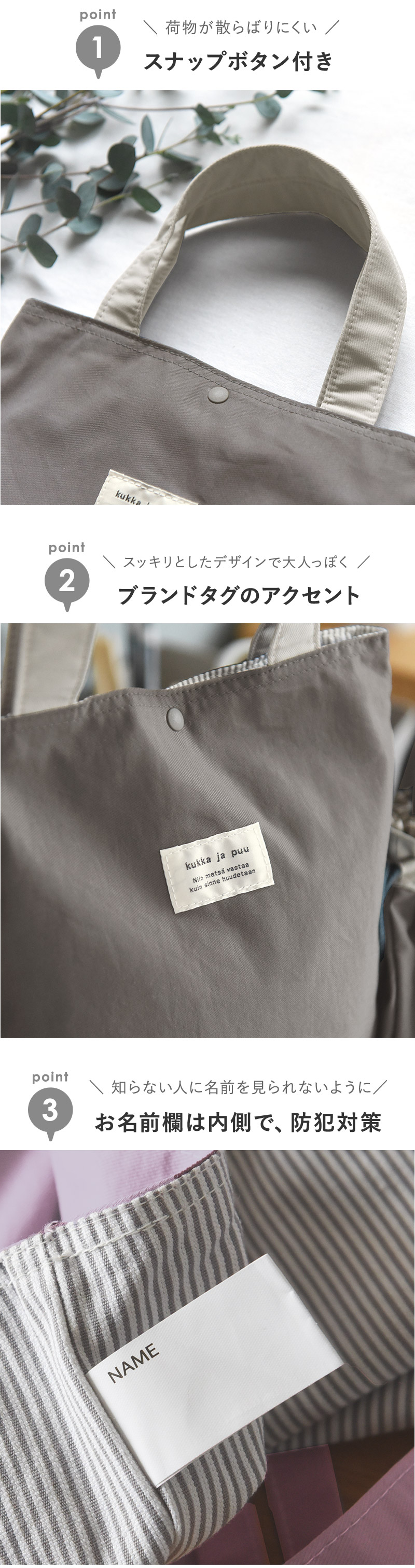落ち着きのあるデザインで長い期間使いやすいのもポイント。1つのものを長く大切に使う、優しい心も育みながら、キッズの成長に寄り添ってくれるシューズバッグです。