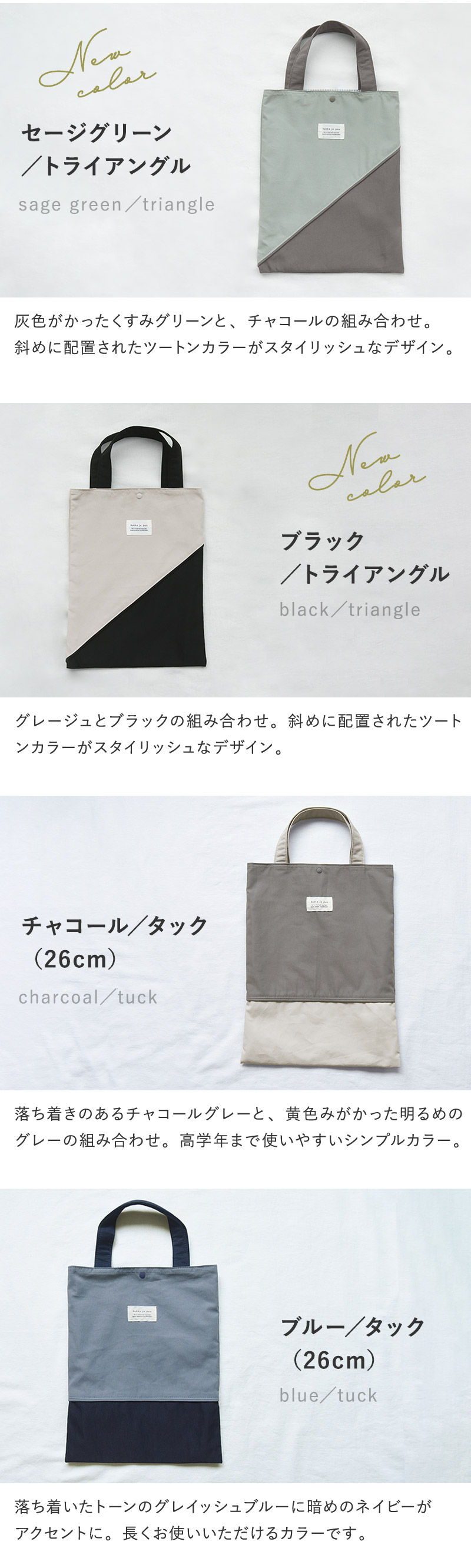 足が大きくなった高学年以降も使える大きめサイズ(約26cmまで対応)を「チャコール/タック」と「ブルー/タック」の2色でご用意しました。低学年から高学年まで成長にあわせてお選びいただけます。