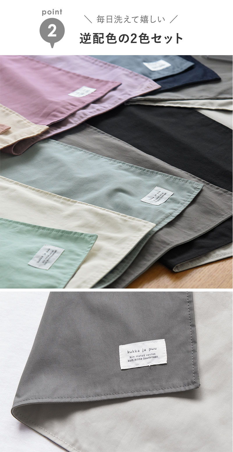 洗い替えに便利な2枚セットだから、毎日使いに◎。表と裏で逆配色になっているので、気分を変えてお使いいただけます。